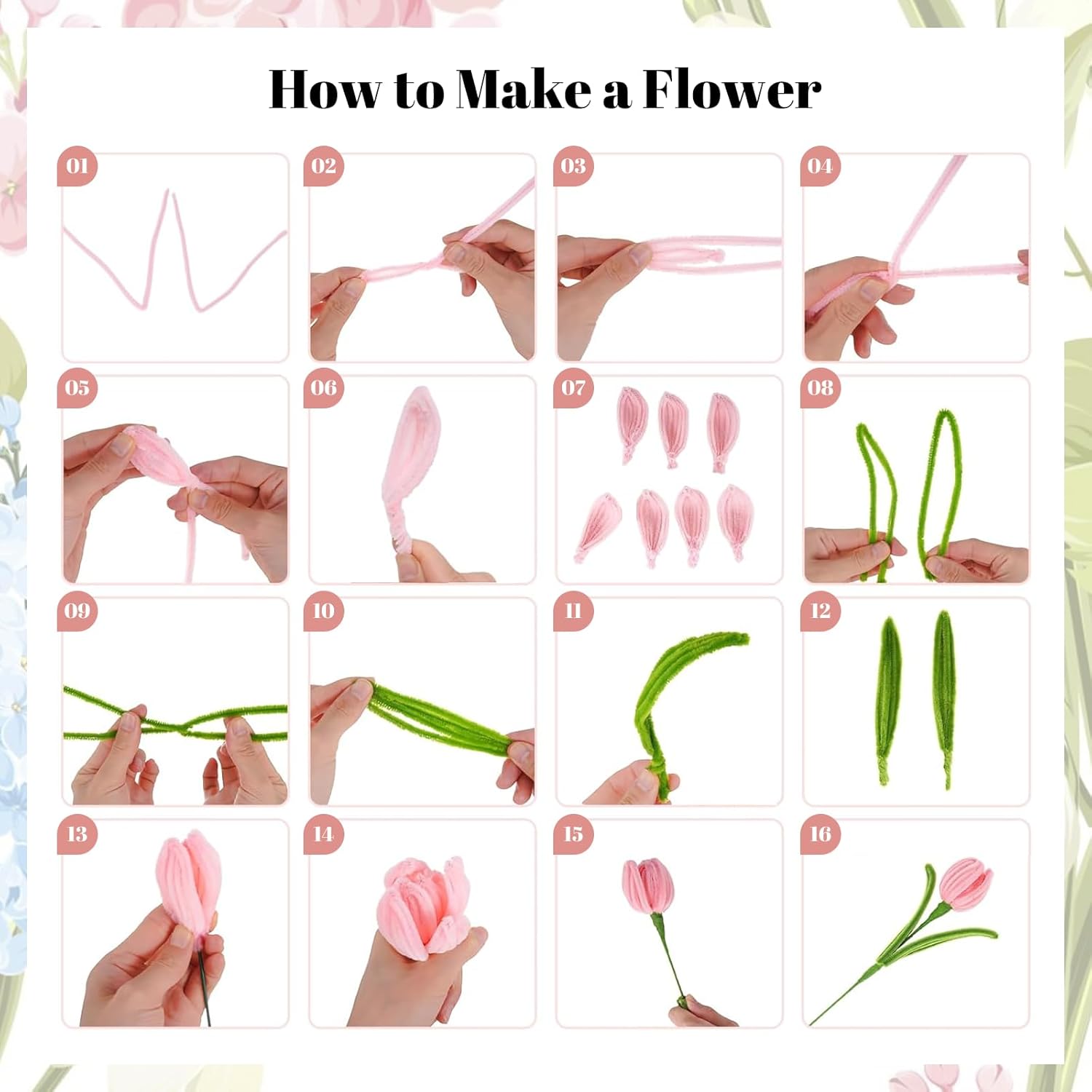 | Included Components | 500 pipe cleaners, 20 floral stems, 2 glue sticks, 150 stamens, 2 wrapping papers, 1 ribbon, 2 floral tapes |