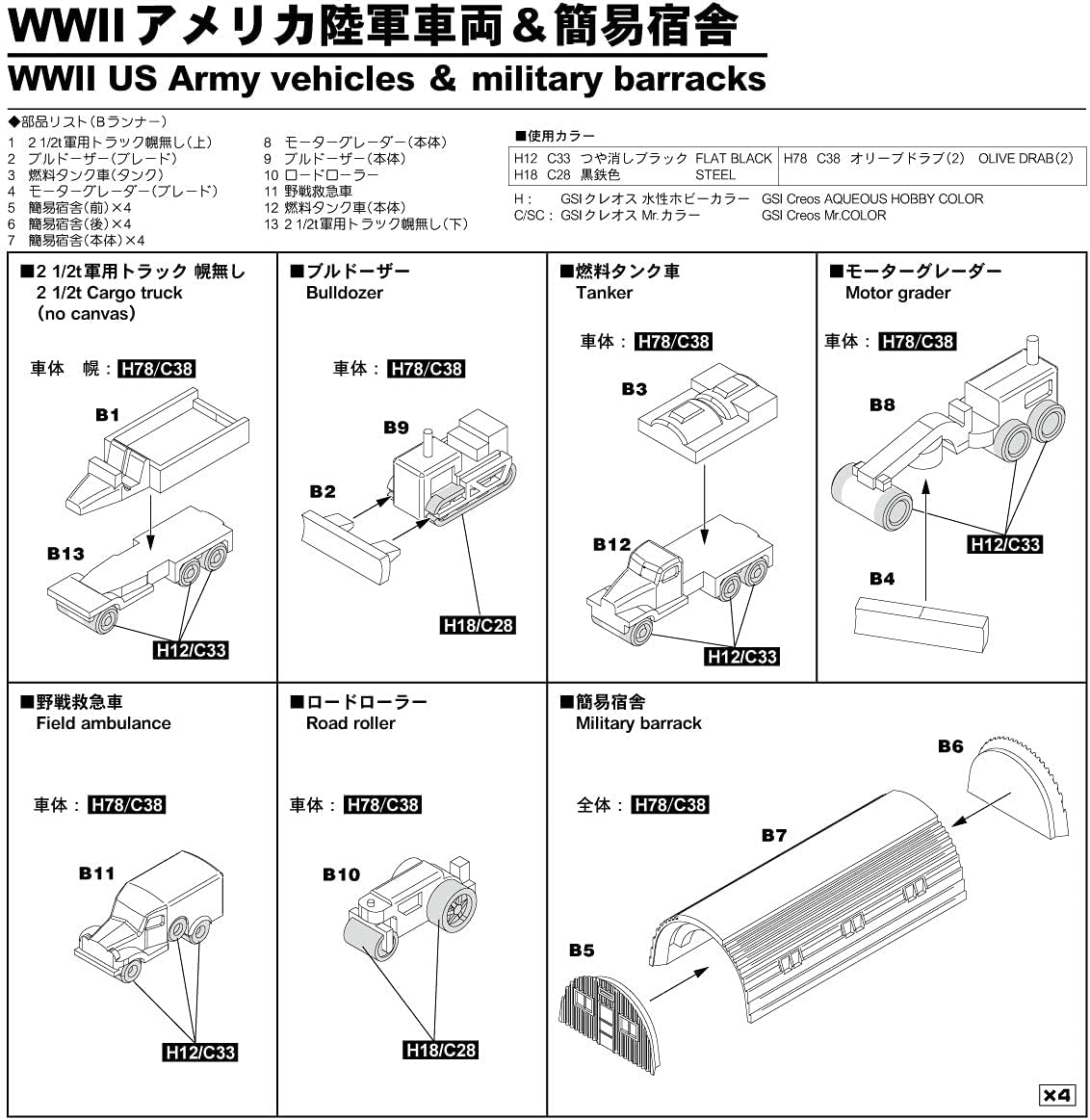A variety of vehicles and easy house sets perfect for making dioramas of the U.S. Army Air Corps in WWII and army bases. Includes 3 each of a Bulldozer, Motor Grader, Road Roller, Fuel Tank Car, 2 1/2t Truck (without Canopy), Ambulance Vehicle Simple basin x 12 buildings. Comes in a hanging bag with tucks. The image is the product assembled and painted. This product is a plastic model that requires assembly and painting. Adhesives, tools, paints, etc., are required for assembly and painting. "Plastic Model" is a registered trademark owned by the Japan Plastic Model Industrial Cooperative Association.