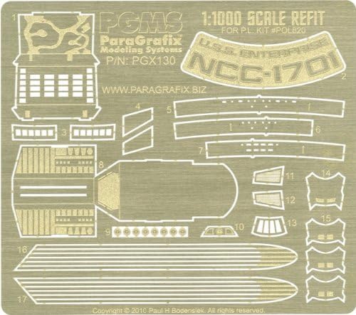 Refit Enterprise (1:1000 scale) Model Kit Photoetch Set. Photoetched from 0.005" (0.13mm) thick bright brass, this set includes: -All docking ports -Shuttle bay -Arboretum & window frames -Officers lounge window frames -Impulse engine grills -Warp engine grills -Planetary sensor covers to make lighting easier* -Drilling guides for saucer edge windows -Nameplate for stand -Suitable for lighting* -Detailed, fully illustrated instructions. *Electronics not included. For Polar Lights kit number POL820.