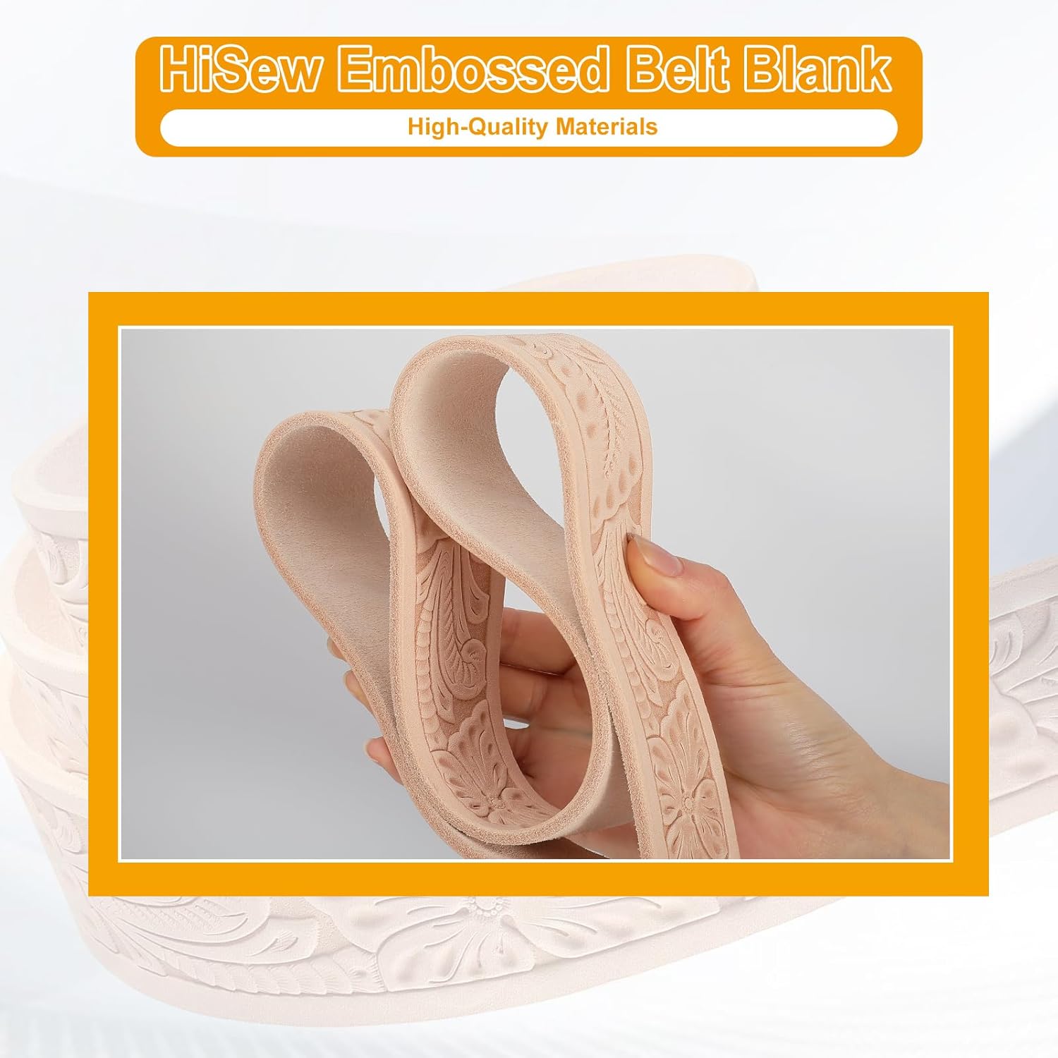 Discover the joy of handcrafted leather with the HiSew Premium Cowhide Leather Strap Blank, designed for craft enthusiasts and professionals. Crafted from thick, high-quality vegetable-tanned cowhide leather, our belt blank offers a consistent thickness of over 10 Oz (greater than 4mm), width of 1-1/2 inches, and length of 45 inches. Durable, flexible, and eco-friendly, it's ideal for various crafting projects.Featuring beautiful pre-embossed patterns such as Floral & Vine, Basket Weave, and Scale Weave, it eliminates the need for advanced carving skills, allowing you to effortlessly create professional-quality pieces. The edges are pre-beveled and polished, offering a smooth finish that is easy to work with. Cut, dye, and finish the belt according to your preferences to create a unique custom belt.Each belt blank comes with a matching belt loop and buckle connector to assist you in completing your project. (Note: Belt buckle and screws are not included) Whether you're a beginner or an experienced leatherworker, you can easily get started and unleash your creativity.Beyond belt making, the high-quality leather strap can be used for jewelry making, hand sewing, and other leather accessories, allowing your creativity to extend infinitely.