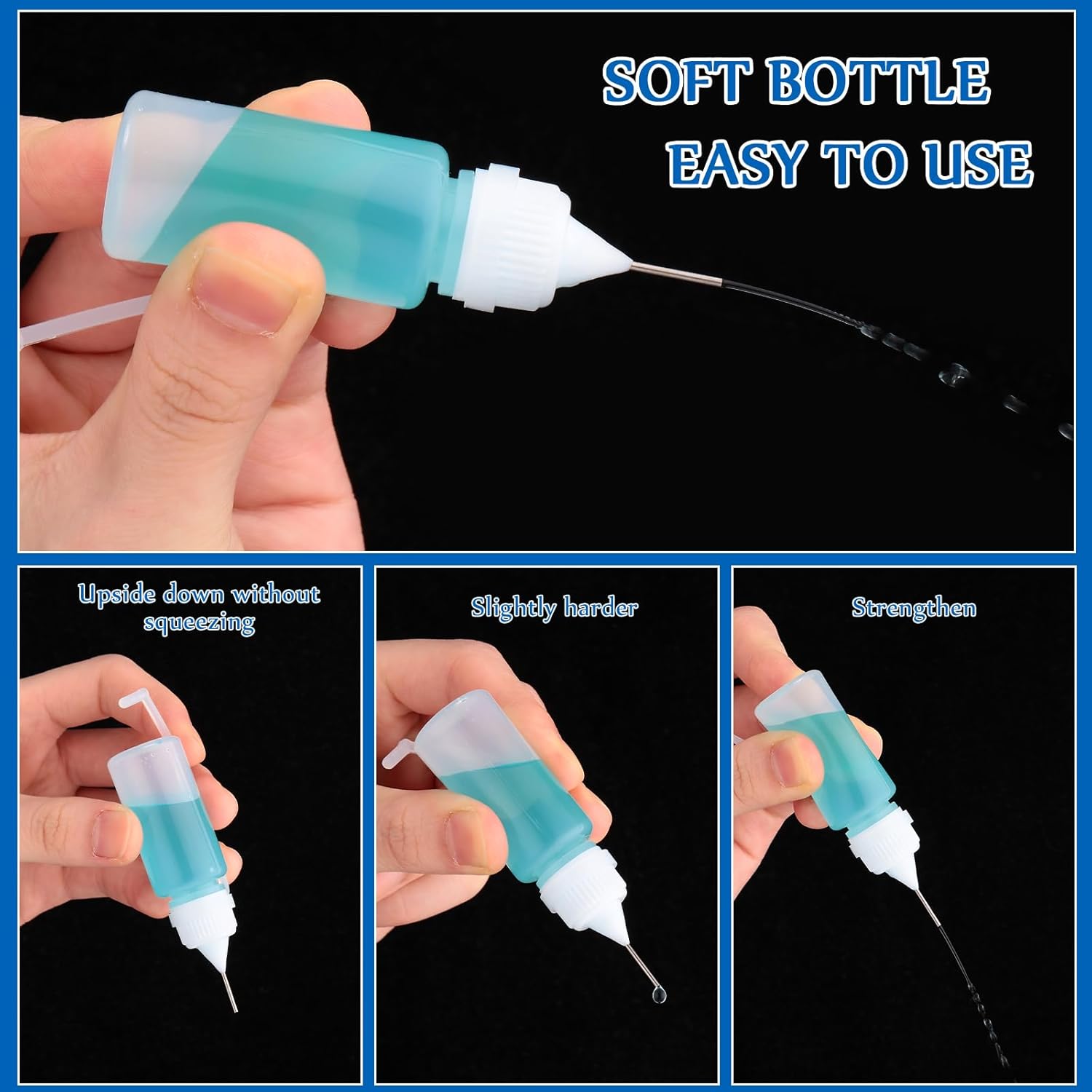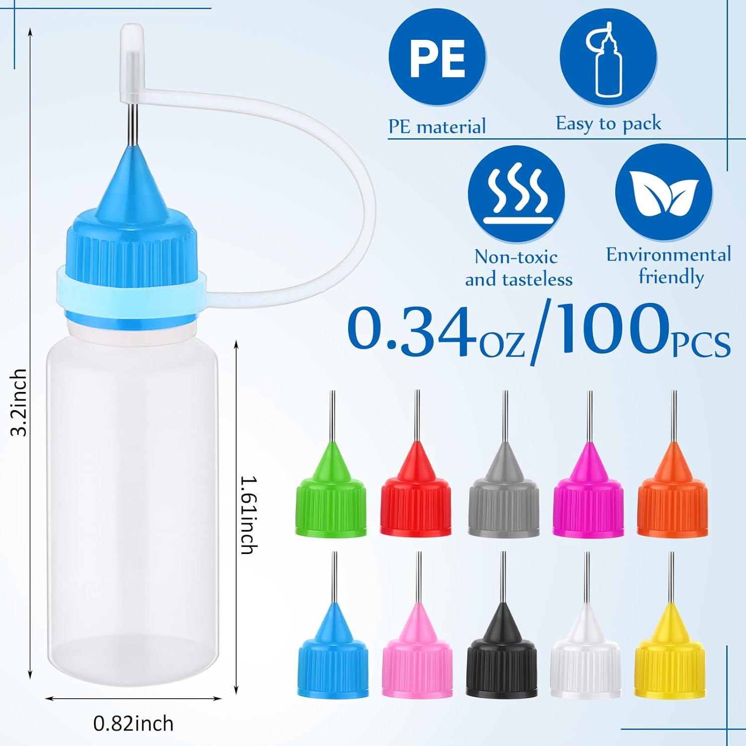 Features: Mini size: The bottle is about 3.2 inches long and can hold 10 ml/ 0.34 oz of liquid. It is small in size, easy to control and more precise in work, suitable for small batch work or detail work. Transparent bottle: The translucent design of the paint bottles can distinguish the liquids of different uses, and can better observe the capacity of the liquid inside. Specifications: Quantity: 100 pieces Main material: PE Color: as the picture shows Size: about 3.2 x 0.82 x 1.61 inches Capacity: about 10 milliliters Package Contents: 100 x Mini squeeze bottles Warm Notice: Please fill squeeze bottle with thin or not too thick liquid to avoid clogging. The opening must be kept clean after use, otherwise the glue will harden at the tip. Please allow differences due to manual measurement. Due to the difference of light and monitor, the color may be slightly different. Poking risk may exist, please put away from little kids.