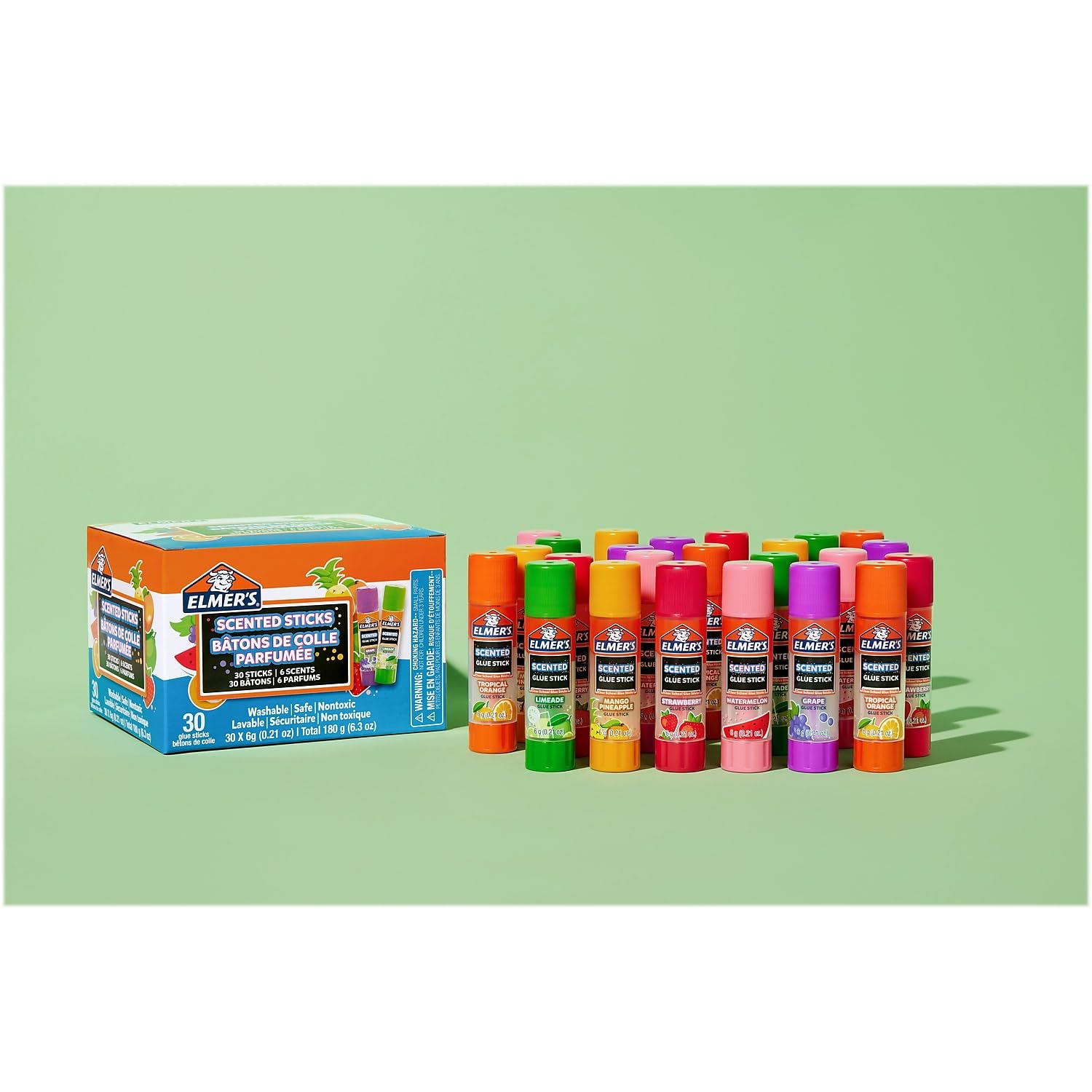 Inspire your child’s imagination with Elmer’s Scented Glue Sticks! With fun scents, your young learner will be delighted as they work on their next school project. This variety pack features 30 scented glue sticks in 6 different scents that inspire fun and creativity. Elmer’s Glue Sticks are a fun way to attach items to paper, display board, foam board, photos, and much more. Featuring a washable, safe, and nontoxic formula, it’s no wonder why Elmer’s school glue is perfect for kids in the classroom and at home. Warning: Choking hazard. Small Parts. Not suitable for children under 3 years of age. Not food. Do not eat.