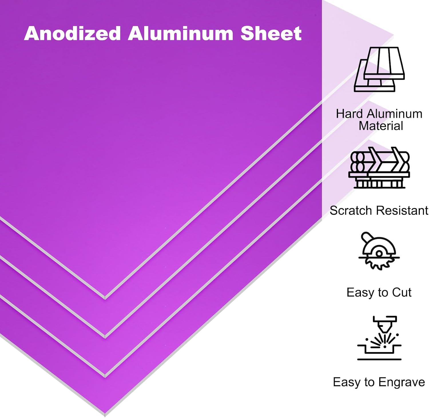 Anodized aluminum sheet is widely used in mechanical parts, architectural decoration, household handicrafts, automobile parts decoration, aerospace equipment, power transmission iron frames, ship equipment hardware, etc. By laser engraving, it can be designed for signs, badges, metal plaques, trophies, business cards, label plates, etc.SpecificationMaterial: AluminumColor: PurpleSize(LxWxT): 305x305x0.8mm (12x12x1/32inch)Package List: 1 x Anodized Aluminum SheetAdvantageMade of quality aluminum material, the anodized aluminum sheet is preservative, hard, sturdy, and not easy to deform. It has a smooth surface and good scratch resistance after oxidation treatment without cracks or holes, does not easily adhere to dust, is easy to clean even if dirty, perfect for precise processing. Easy to cut and engrave, use professional machines to easily design personalized engraving items.InstructionUse a professional laser printer to engrave the desired patterns and information. It can be designed for gift signs, signs for commercial buildings, interior decoration supplies, advertising boards, mailbox address and message plates, etc.NOTE1. The front of the anodized aluminum sheet has an anti-scratch layer, please take off it before use.2. Please take personal protective measures when designing engraved items.