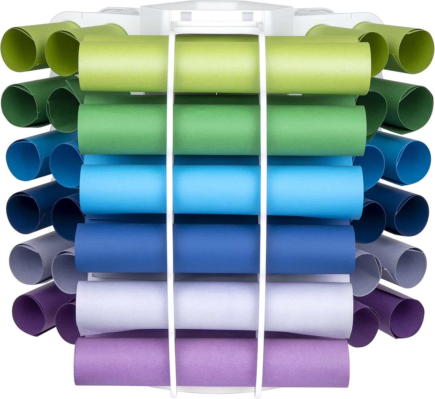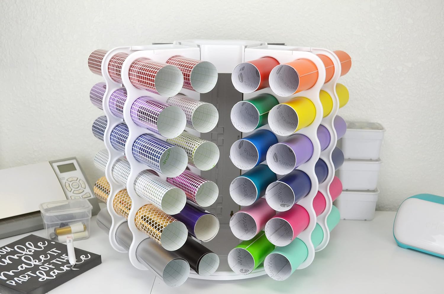 The ArtBin Vinyl Storage Tower has the capacity to safely store up to 36 vinyl rolls. Not only can you store your rolls of vinyl but there is a designated open space onto to store your cutting tools. Storing your vinyl in the ArtBin Vinyl Storage Tower will not only organize your craft space but make it look even more aesthetically pleasing!
