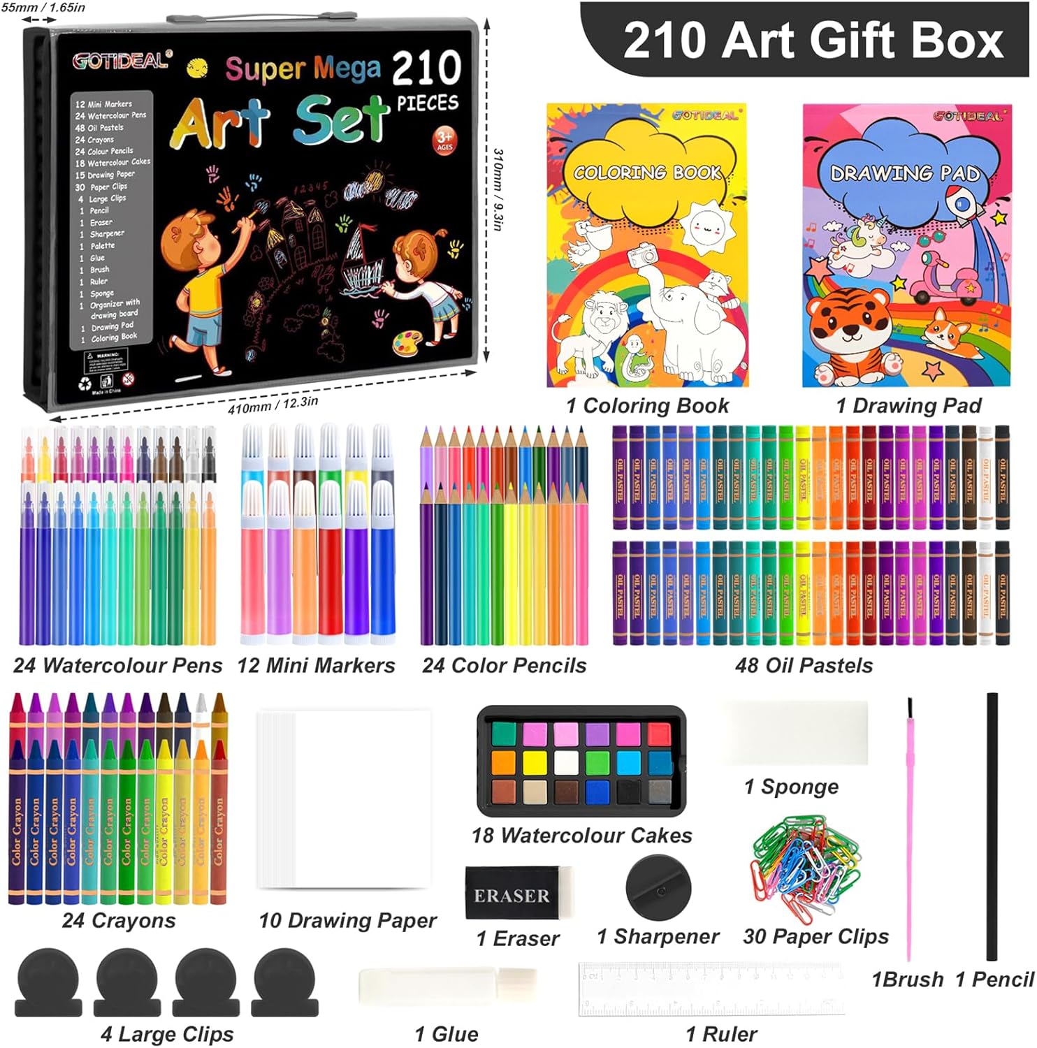 | Included Components | 24 watercolour pens, 12 mini markers, 24 colored pencils, 48 oil pastels, 24 crayons, 18 watercolour cakes, 10 sheets of drawing paper, 1 coloring book, 1 drawing pad, 4 large clips, 30 paper clips, 1 eraser, 1 sharpener, 1 sponge, 1 glue, 1 ruler, 1 brush, 1 pencil |