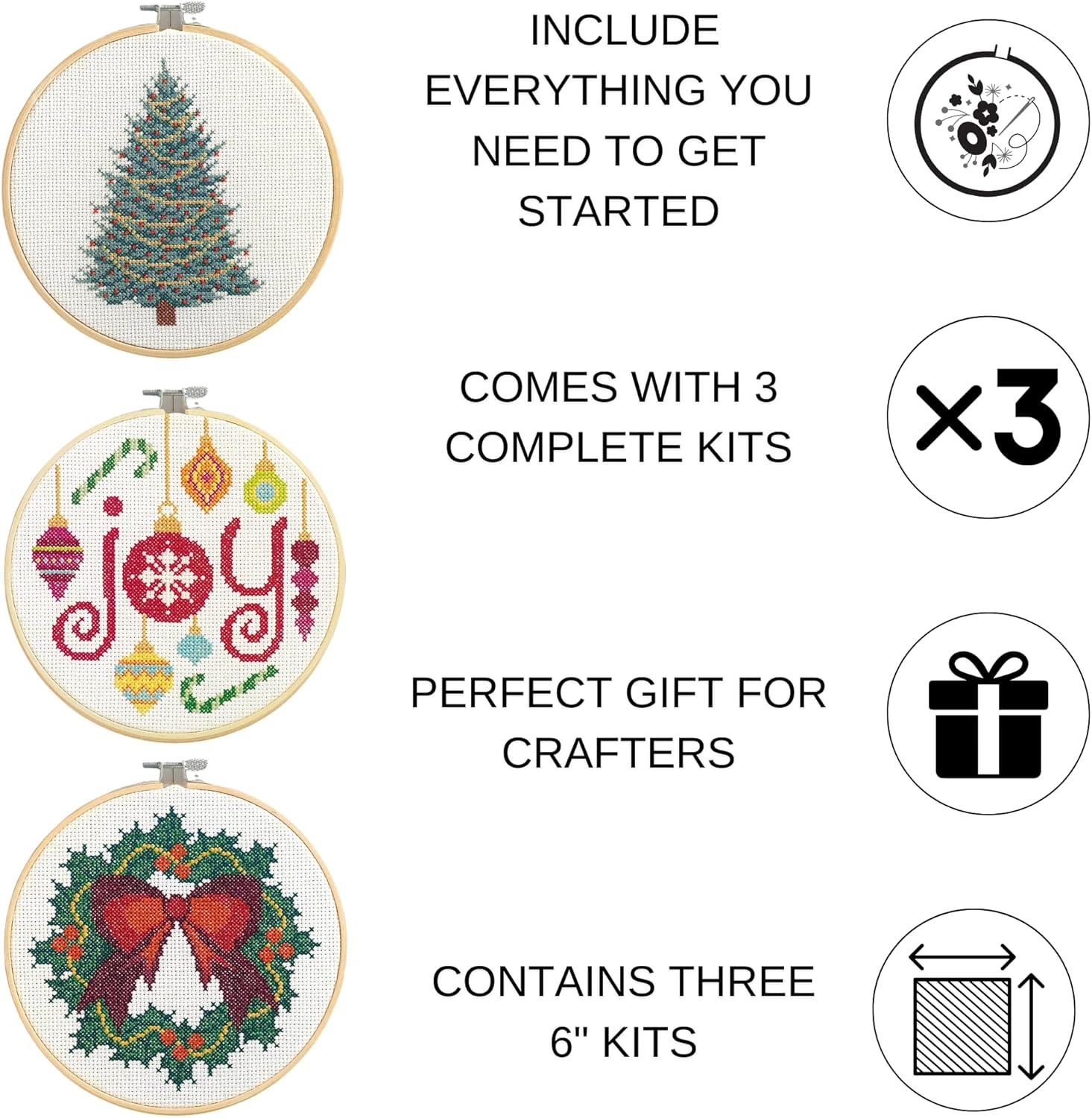 Leisure Arts Kit Cross Stitch 3 peice set- Christmas tree, holiday wreath and hanging bulbs with the word joy. Printed embroidery design for easy completion. Can be completed and used as a wall decoration for your living room, bedroom, office and anywhere else you want a little flowery cheer. It can be a beautiful present for your wife, kids or friends to wish them happy birthday. This embroidery kit with pattern and instructions is suitable for any skill level, even beginners. Pre-printed fabric and instructions make it perfect for anyone to learn embroidery. Easy for beginners, adults or kids and printed patterns easy to follow. Also great for teaching Cross Stitch and the steps and stitches to complete a project. What's more exciting than passing on and sharing your craft with others? Includes 3 wooden embroidery hoops, embroidery floss, printed organza fabric, embroidery needle and full-color, step-by-step instructions. Use the embroidery hoop to keep the fabric taught and then to display your project. Makes one design. Colors and contents may vary.