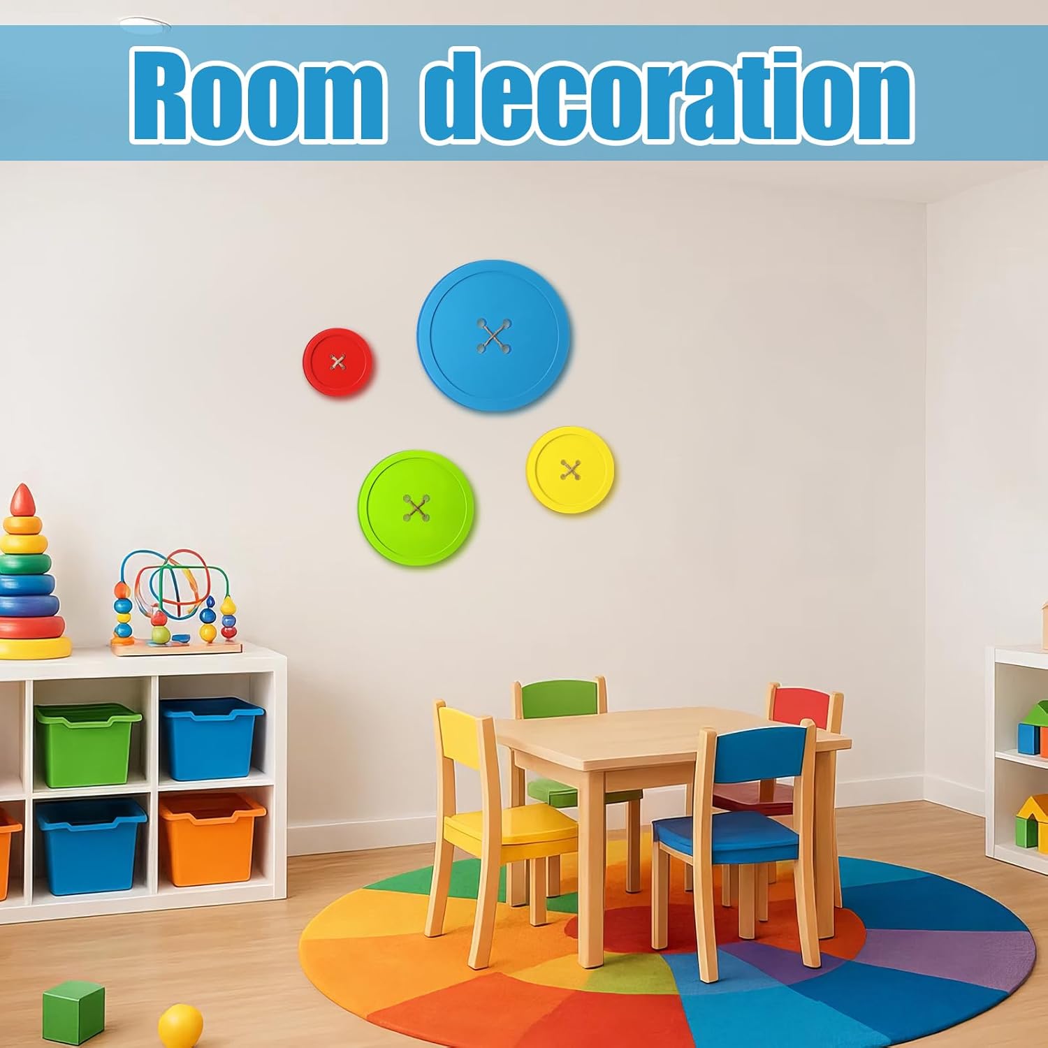 Features: These wooden cutouts by high-quality craftsmanship have smooth surfaces that do not need further sanding. Beautiful giant sewing buttons for your home, these signs make the perfect gifts for your loved ones! Specifications: Material: wooden Color: blue, green, yellow, red Size: The blue button is about 11.02 inches/ 28 cm diameter The green button is about 8.66 inches/ 22 cm diameter The yellow button is about 5.12 inches/ 13 cm diameter The red button is about 3.94 inches/ 10 cm diameter Package includes: 4 x Giant sewing buttons Notes: Manual measurement, please allow slight errors on size. The color may exist a slight difference due to different screen displays