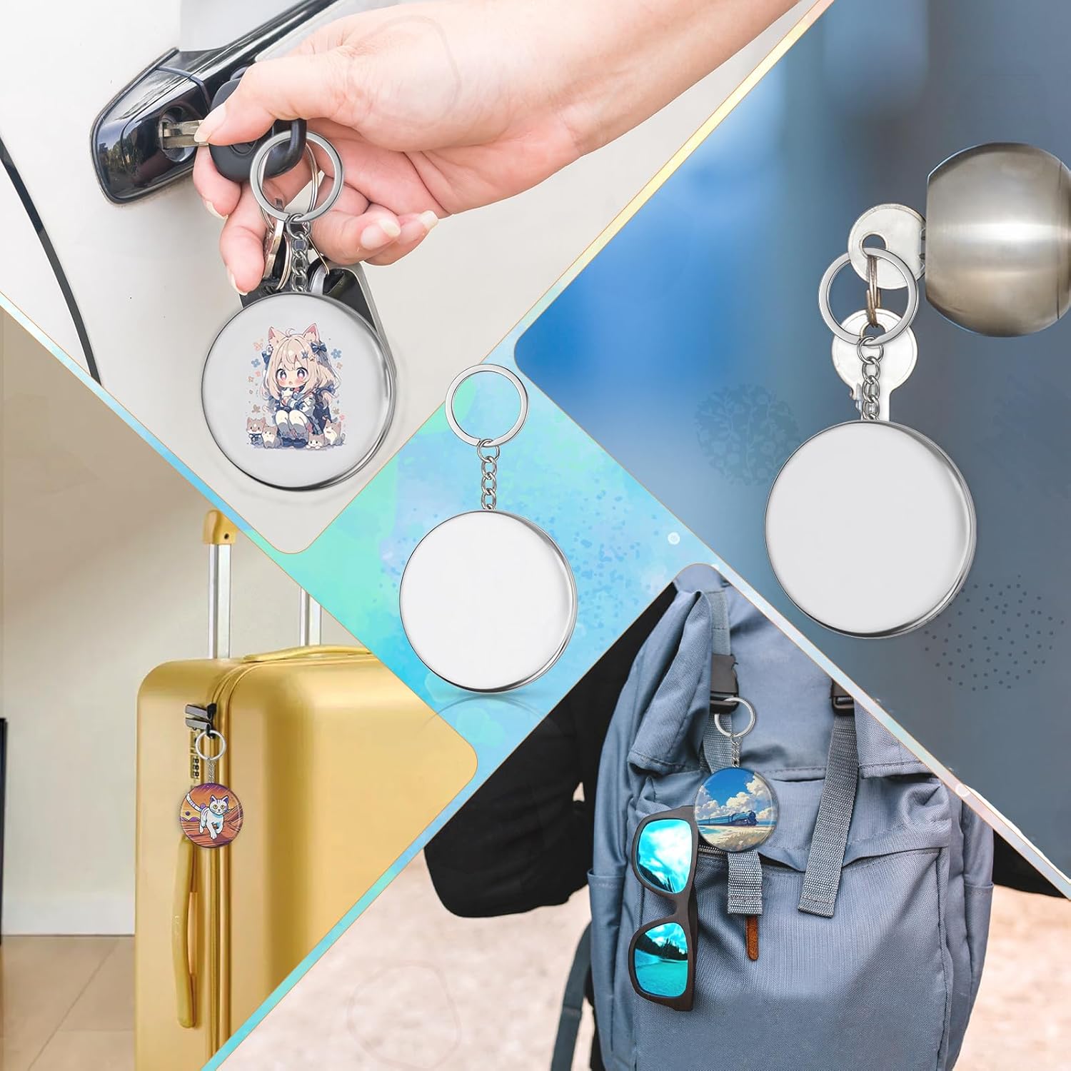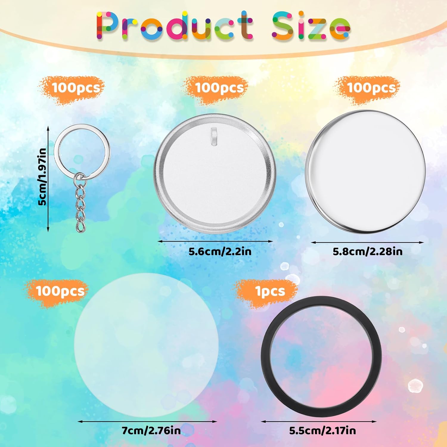 Compact and Portable: This 58mm button supplies is a moderately sized piece, not bulky when hung on your keys, and easy to carry. The keychain maker's metal ring is sturdy and durable, with good load-bearing capacity, so you don't have to worry about it accidentally falling off or getting lostDIY Creation: This button pin maker can be freely combined with photos, stickers, and hand-drawn patterns, offering unlimited creative possibilities. The keychain maker's silver metal casing is simple and versatile, matching various design styles, resulting in a stylish finished productProduct Name: Button Maker SuppliesMaterial: Iron Alloy + PVCColor: Silver, Clear, BlackProduct Dimensions:Metal Case: 5.8cm/2.28inch (diameter)Clear Film: 7.0cm/2.76inch (diameter)Back Cover: 5.6cm/2.20inch (diameter)Keychain: 5.0cm/1.97inch (length)Ring: 5.5cm/2.17inch (diameter)Packaging: BoxedPackaging Dimensions: 21x11x14cmPackaging Weight: 1451gPackage List:100Silver Metal Cases100Clear Films100Silver Back Covers100Silver Keychains1Black Ring