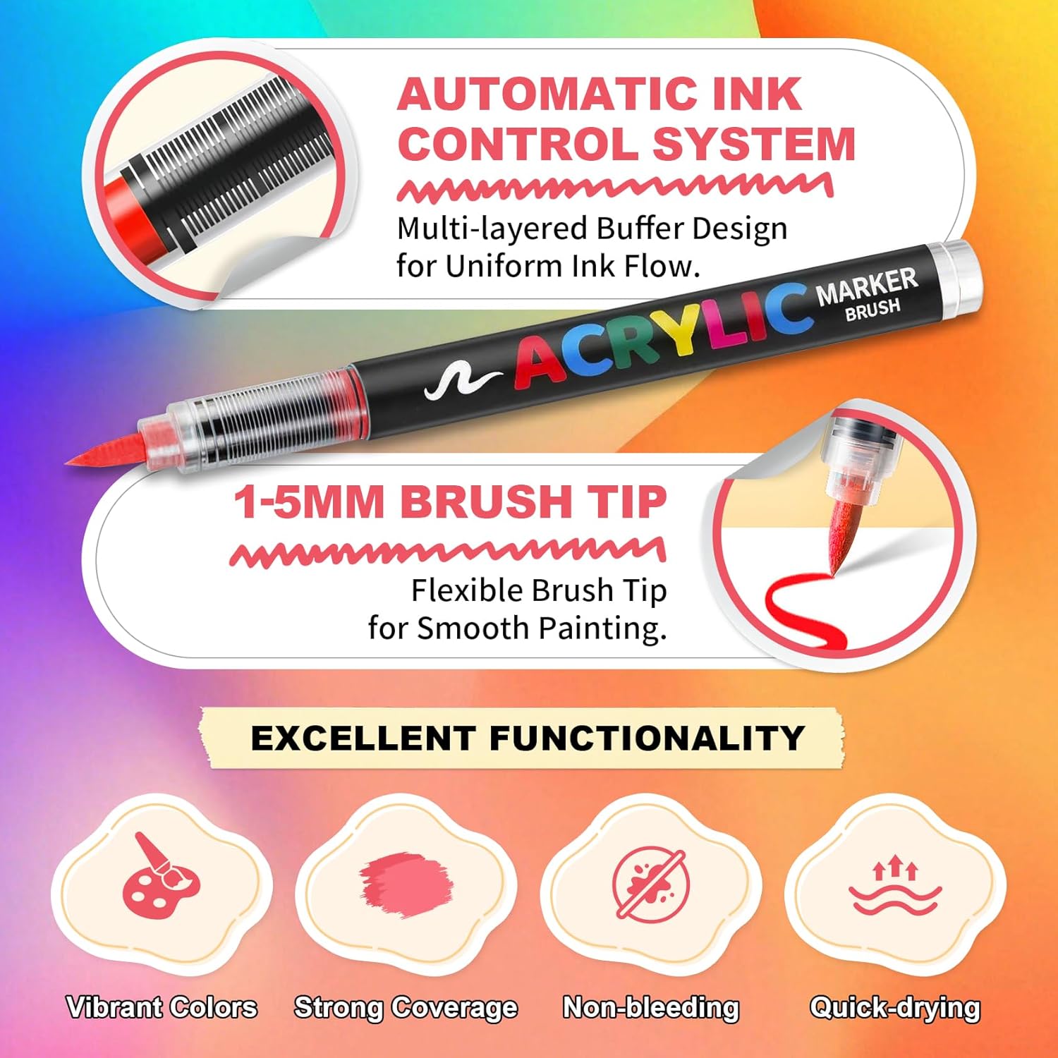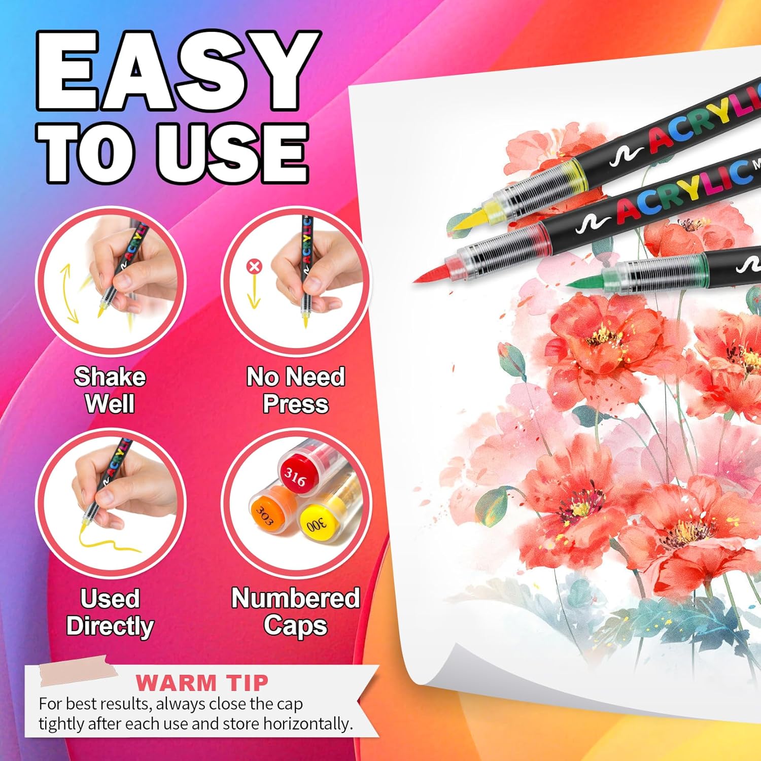 Acrylic markers set,features highly pigmented acrylic paint with excellent coverage,effortlessly covering dark surfaces and underlying colors.Quick-drying with minimal risk of smudging or bleeding,it ensures vibrant and rich colors in your artwork.1.Flexible tip,the brush tip is soft and flexible,effortlessly dispensing ink without the need for pressing.By adjusting the pressure, you can create smooth lines ranging from 1 to 5 mm,meeting your needs for detailed outlining and large-area coloring.2.Automatic ink control,equipped with a unique automatic ink control system,the handle area features a multi-layer buffer design,shake well before use to ensure even ink flow.After use,immediately cap the pen and store it horizontally.3.Versatile use,acrylic paint markers are suitable for various surfaces,including paper,wood,plastic,stone,glass,fabric,and more,allowing for DIY creative projects and effortlessly unleashing your creativity.