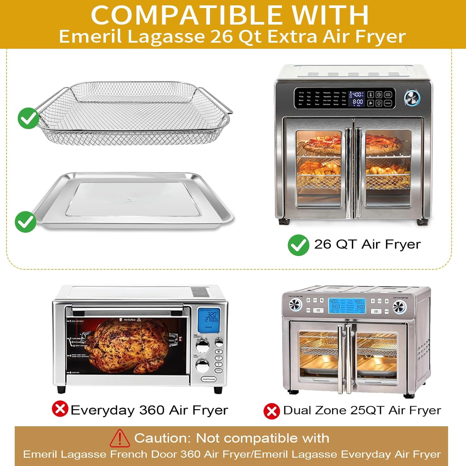 We are committed to providing customers with premium products, and customer satisfaction is our top priority. Our product is made of food-grade stainless steel, meeting FDA standards and free from BPA. It is non-toxic and tasteless, making it an excellent option for safe and healthy cooking. Why choose our Product? ->Easy to take out from the frying basket. ->Food Grade Material: Enjoy healthy cooking with food-grade materials. Ideal for making pizza, french fries, steak, chicken wings, and fried vegetables. No need to worry about hazardous chemicals. ->Stainless Steel, durable and easy to remove food residue. Dishwasher safe for easy cleaning, suitable for all your air frying needs. Specification: -Material: Steel -Basket Size:12.5" x 10.2" x 1.3" -Grill Pan Size:12.2"×11.2"×0.8" -Baking Mat Size: 11.8"×11.8" -Parchment Paper Size: 11.8"×11.8" What you can get: -1* Air fryer grill mesh basket -1* Air fryer grill pan -2* Non stick Baking mat -100* High-quality Parchment Paper Warm Notice: 1. Please measure your device to ensure it fits before placing an order! 2. Please avoid using rough abrasive cloths or metal balls to clean air fryer accessories as this can cause damage to the accessories. 3. Do not clean the air fryer basket while it is still hot. It must cool down before handling. 4. You can put the accessories in the dishwasher to clean, but it's better to wash them with a dishwashing cloth. 5. Customer service is our top priority. Please feel free to contact us if there is any quality problem. We will exchange the items for free or provide a refund.