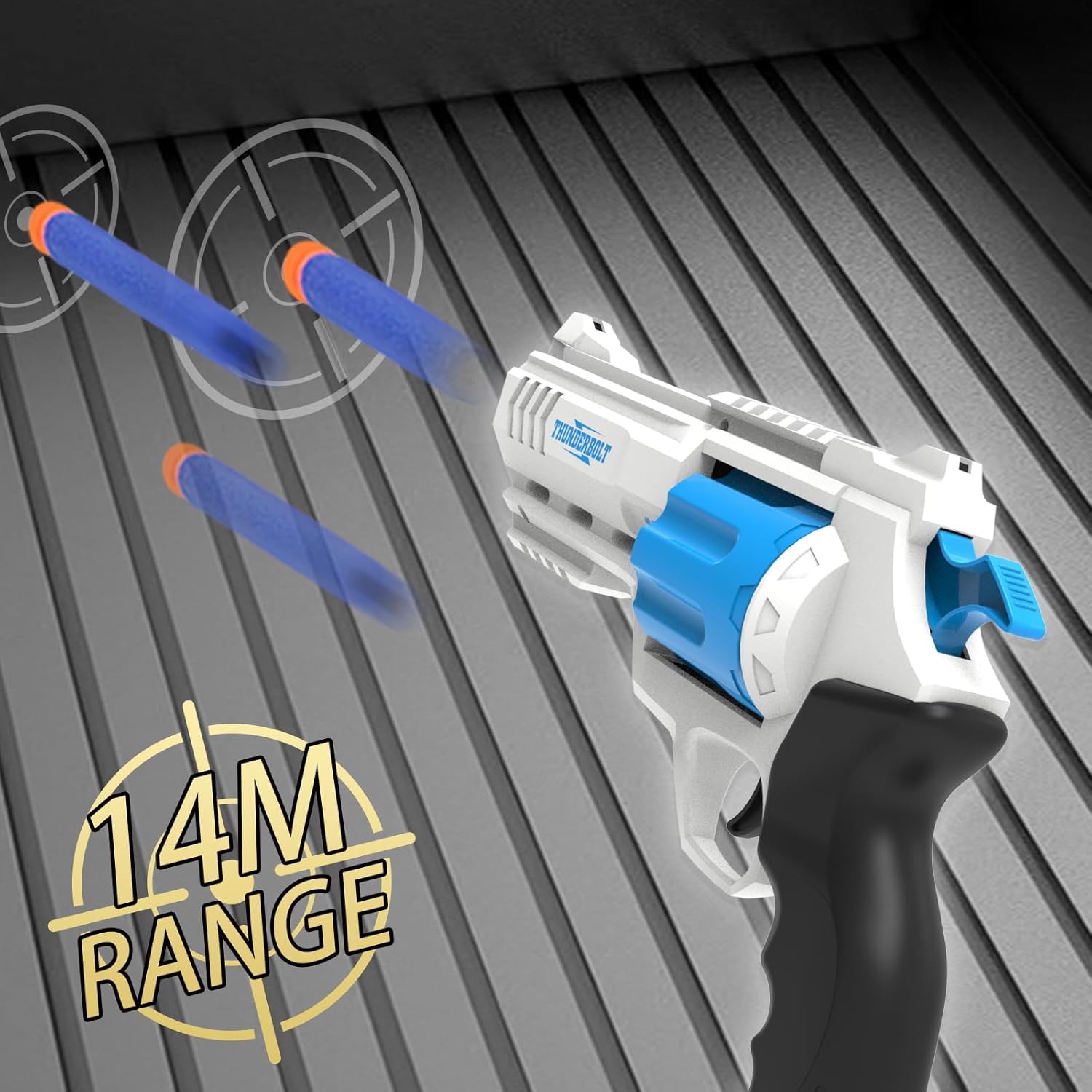 | Special Features | Revolver-style rotating barrel, suction cup darts for aiming practice |