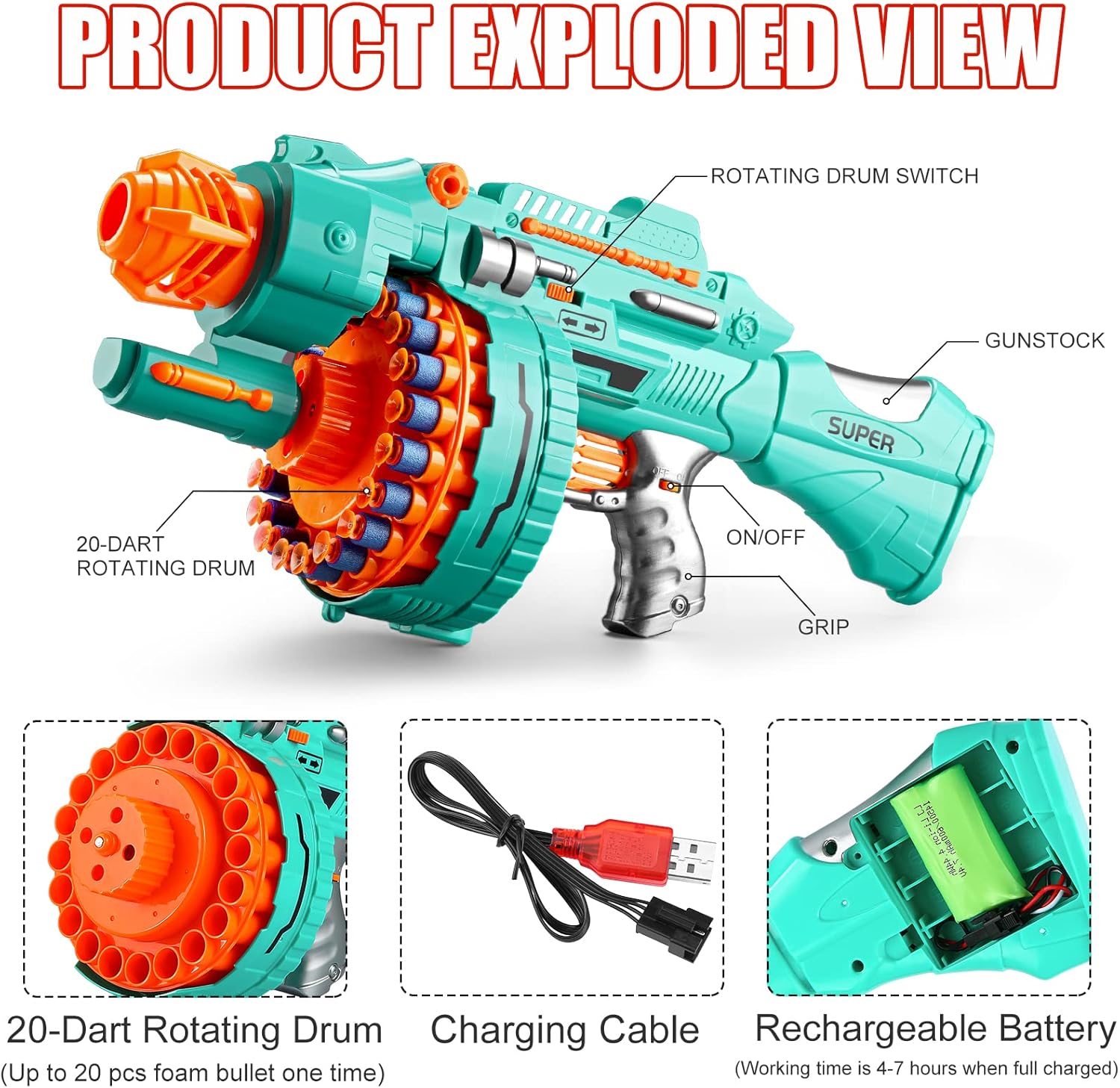 Ideal Gifts for Kids: Packaged in a stylish and beautiful color box. A special Christmas gift, Birthday gift or New Years gift for your kids. This full auto gun toy develops children's interest and imagination. If you are looking for a gifts for 8-12 year old boys or even adults, this full auto gun toy is exactly what you need! Features: -USB Rechargeable Battery -Electric motorized shot long distance up to 35-50 FT -20-Dart Rotating Drum -200 Foam darts(100 suction cups & 100 standard tips) -Great Birthday Xmas Gift for kids Package Includes: -1* Toy gun -200* Foam darts -1* Rechargeable battery -1* USB Charge cable -1* Screwdriver Notice: -Do not shot towards the face. -Kids should play the gun under the guidance of adults. -Our toy guns are well designed and generally will not get stuck under normal operation. In the event of a jam, the drum will activate the protection mechanism to automatically power off. At this point, just open the gun head and take out the stuck bullets to resume normal work.