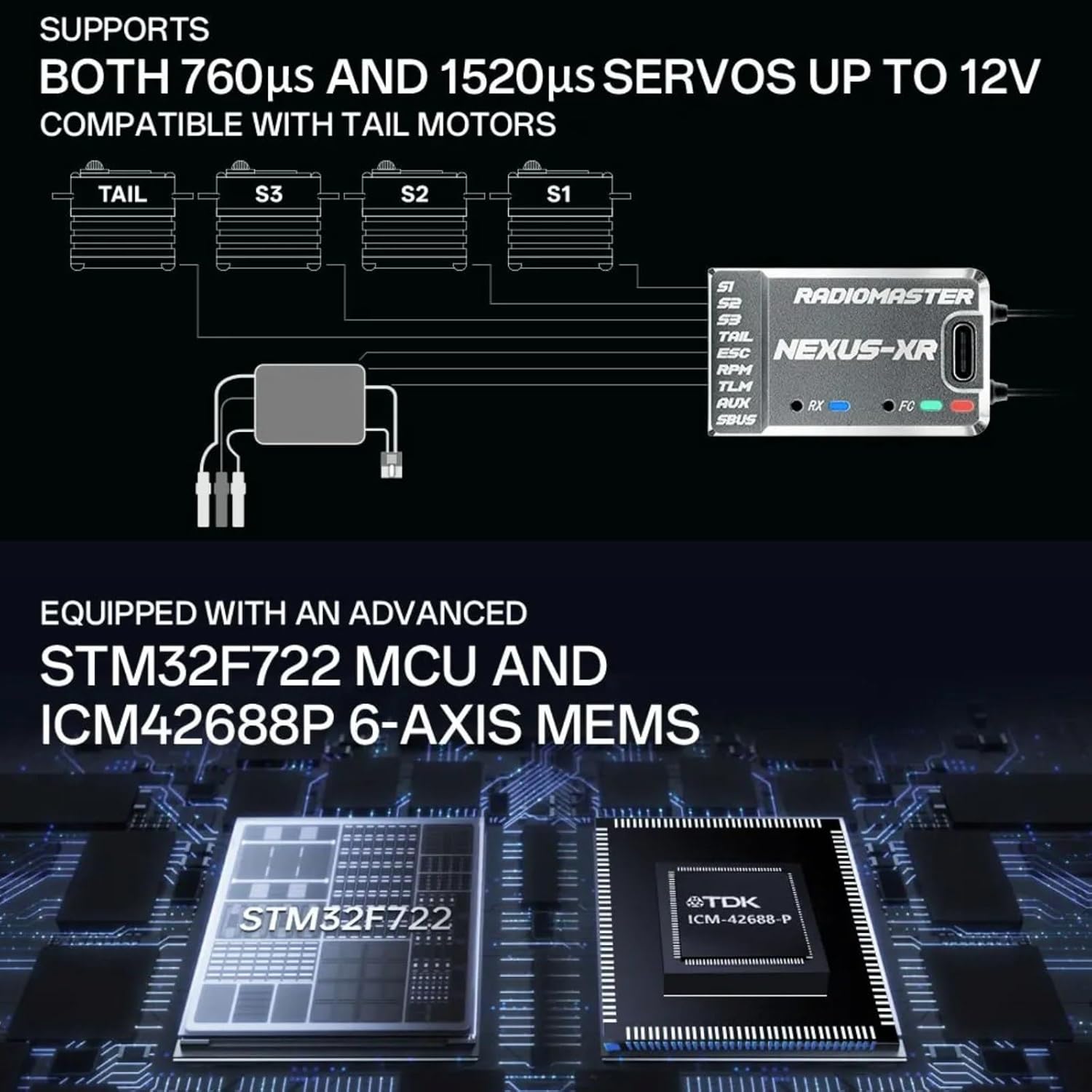SpecificationImproved BEC: Stable, reliable power delivery to electronics for enhanced performance.1. Improved BEC: Stable, reliable power delivery to electronics for enhanced performance. 2. Firmware: Pre-installed Rotorflight 2.2 for optimal compatibility and flight performance. 3. Core Hardware: STM32F722RET6 MCU & ICM42688P gyro (IMU) for precise flight dynamics. 4. Flash Memory: 256MB (W25N02KVZEIR) for detailed black box logging and system tuning. 5. UART Ports: 5 ports supporting S.BUS, TELEM, PORT-A/B/C for versatile connectivity. 6. Servo Support: S1-S3 & TAIL servos (up to 12V); compatible with 760μs/1520μs tail servos. 7. Integrated Receiver: RP4TD-M ExpressLRS 2.4GHz (2x SX1281, 2x 65mm antennas) with multi-protocol support. 8. Power Range: 3.6-70V ext input; 5-16V supply; 5V 1.5A A-B-C serial port output. 9. ESC Compatibility: Supports PWM, Oneshot, Multishot, Dshot; works with tail ESC and motor. 10. Dimensions & Weight: 44.70x26.50x14.30mm; 24.1g, housed in CNC-machined aluminum case.