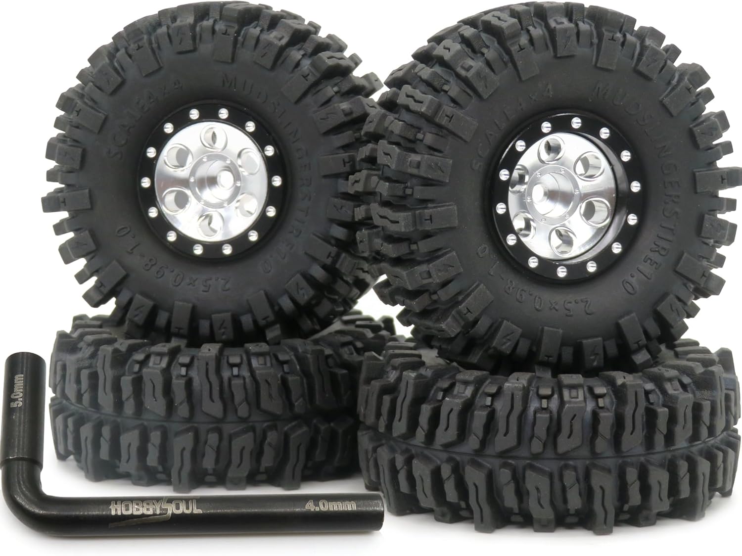 4pcs RC 1.0 Mud Slingers tires + Aluminum 1.0 Beadlock Wheels 7mm Hex Rim weight: 40g( 1pc tire with foam+1pc wheel) For 1:24 SCX24 1/18 TRX4M crawler Package List: 4pcs Adjustable Offset 1.0 Beadlock Wheels + 4pcs Soft sticky 1.0 Mud Slingers tires (This rc 1.0 wheel can be adjustable two offset: -1.5mm & -5.5mm Negative offset, meanwhile wheel with Stainless Steel Middle Ring to adds the perfect weight, Negative offset wheel and Heavy Duty middle ring added stability and help the RC mini crawler performance. ) Description 1. Adjustable two Offset: -1.5mm & -5.5mm ( -1.5mm offset: similar with original axial scx24 wheel offset; - 5.5mm offset: increased spacing between hubs for added stability. Put center part in shallow room offset is -1.5mm, in deep room offset is - 5.5mm ) 2. Made in the HOBBYSOUL Soft Sticky Compound tires + Aluminum Wheel with Stainless Steel Middle Ring ( Tire material better than common rubber,good heat resistance and good cold resistance, high wear resistance and excellent durability. ) 3. Tire diameter: about 64mm (2.5inch) 4. Tire Width: 25mm (0.98inch) 5. Wheel hex: 7mm 6. Weight : about 40g/pc ( 1pc tire with foam + 1pc wheel ) 7. Axle Through Hole Dia.: 3.0mm (0.118inch) Fit for 1:24 RC Crawler Axial SCX24 90081 AXI00001 or 1/18 TRX4M and other mini crawler.....
