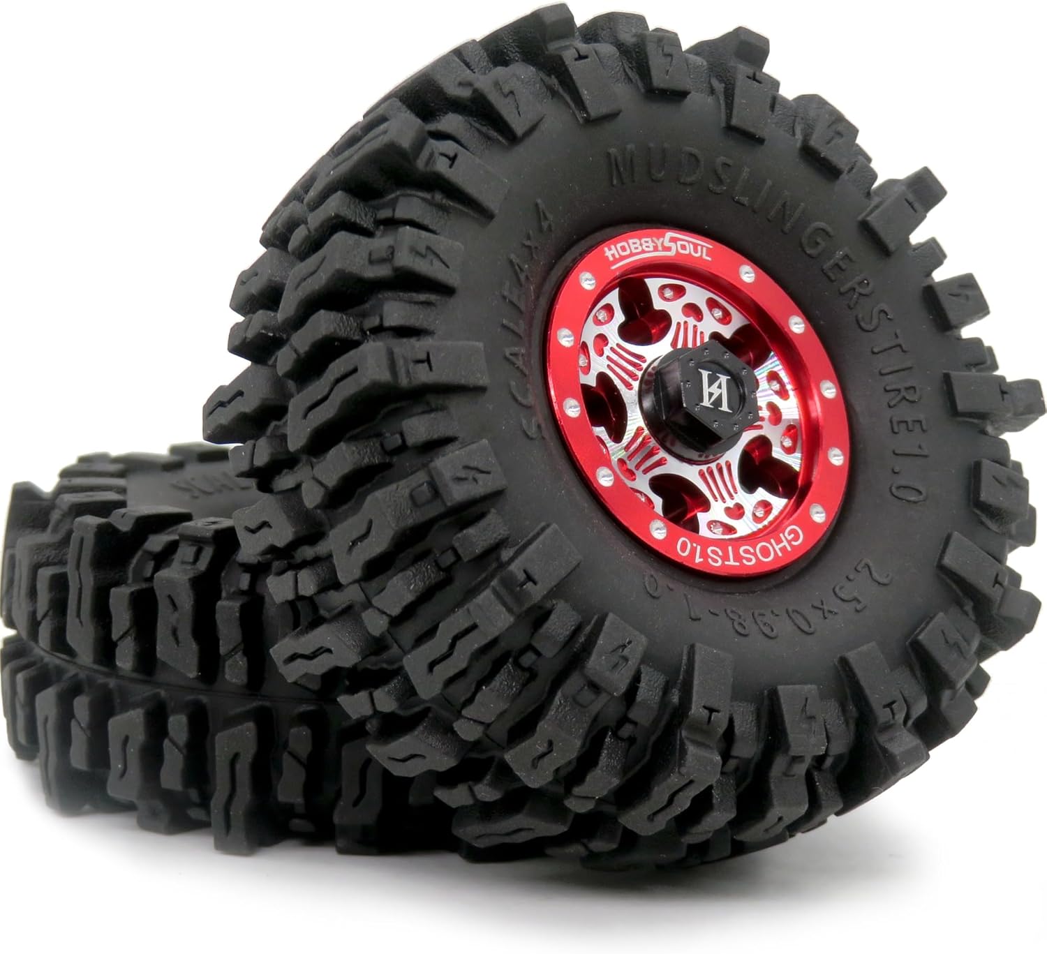 4pcs RC 64mm x 25mm size 1.0 Mud Slingers tires + Heavy Aluminum 1.0 Beadlock Wheels 7mm Hex Rim weight: 39g( 1pc tire with foam+1pc wheel) For RC Crawler 1/24 Axial AX24 SCX24 FMS FCX24 1/18 TRX4M Upgrade Package List: 4pcs 1.0 Beadlock Wheels + 4pcs Soft Compound 1.0 mud slingers tires ( wheel with Stainless Steel Middle Ring to adds the perfect weight, Soft Compound Tires delivers maximum gripping power for loose conditions - dry and loamy, or wet and muddy and rock.) Description 1. Material: Aluminum Wheel ( with Stainless Steel Middle Ring) + HOBBYSOUL Soft Sticky Compound tires 2. Tire diameter: 64mm (2.5inch) 3. Tire Width: 25mm (0.98inch) 4. Wheel hex: 7mm 5. Weight : about 39g/pc ( 1pc tire with foam + 1pc wheel )