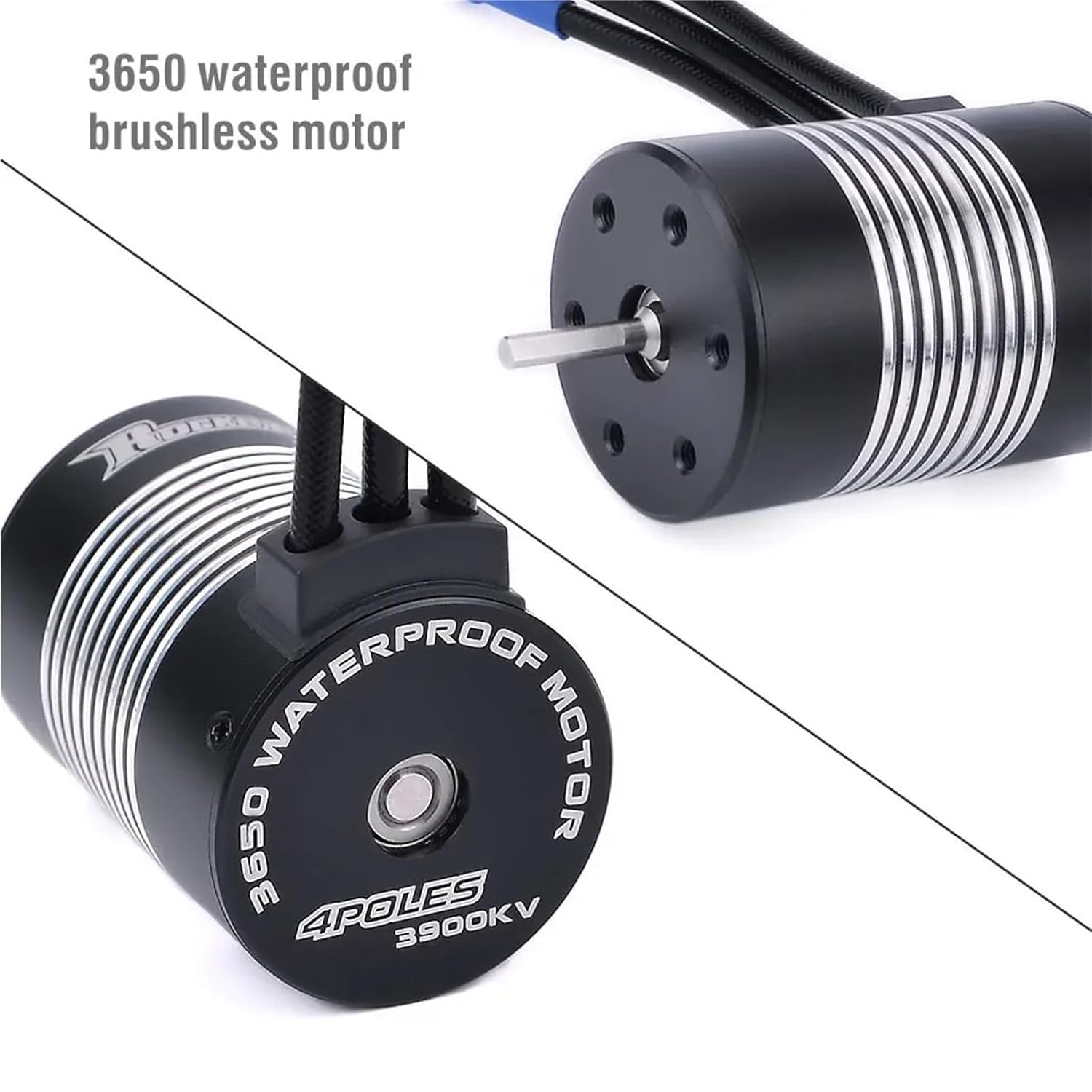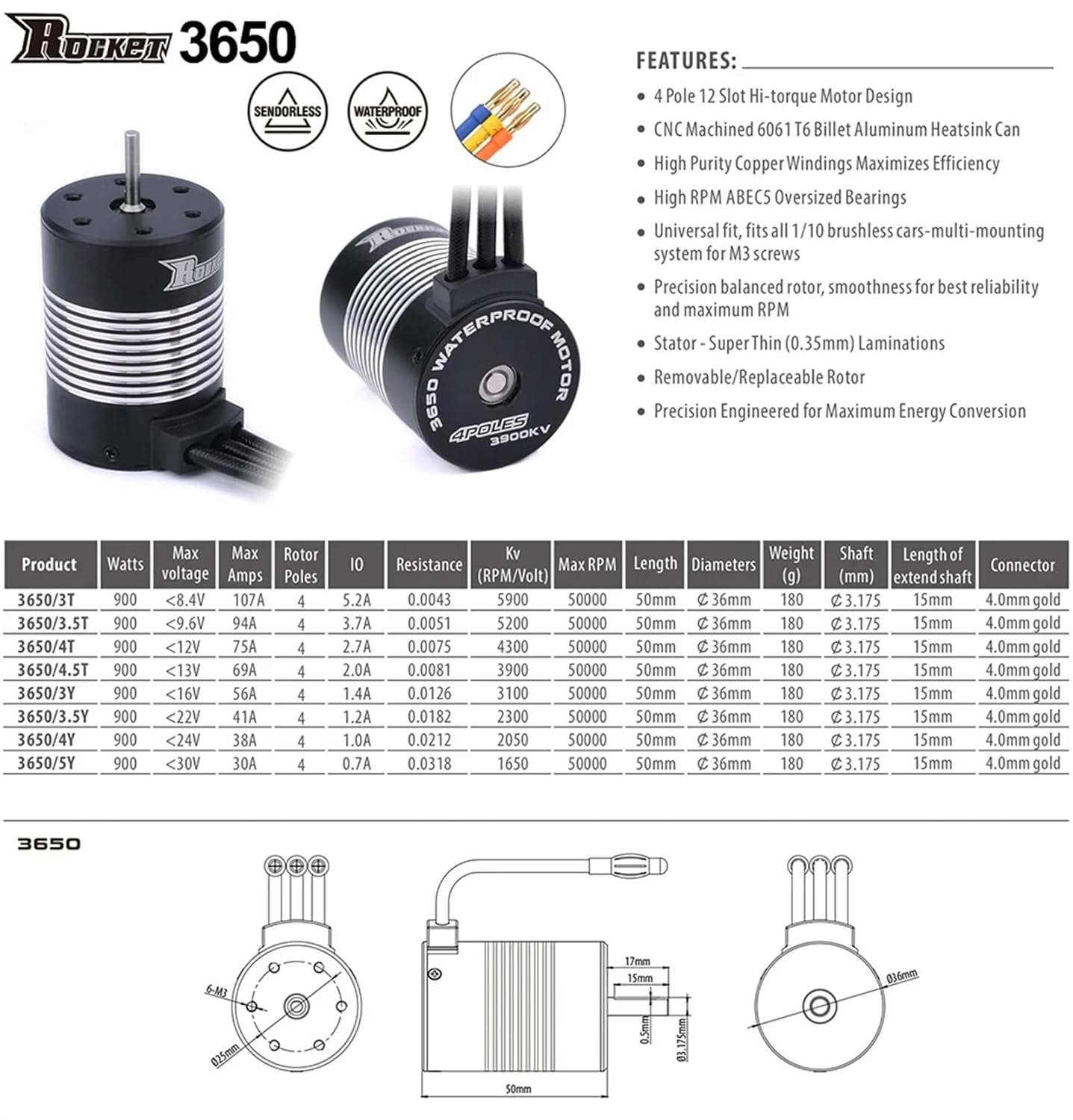 Features:1. 4 Poles 12 slots Hi-torque motor design2. CNC machined 6061 T6 billet aluminum heatsink can3. High purity copper windings maximizes efficiency4. High RPM ABEC5 oversized bearings5. Universal fit, fits all 1/10 brushless cars-multi-mounting system for M3 screws6. Precision balanced rotor, smoothness for best reliability and maximum RPM7. Stator - super thin 0.2mm laminations8. Removable/Replaceable rotor9. Precision engineered for maximum energy conversionSpec:Model: Black 3650KV(RPM/Volt): 3900Max Watts: 900WMax Voltage: <13VMax Amps: 69APoles: 4IO: 2.0AResistance: 0.0081ΩMax RPM: 50000Motor Size: ø36x50mmShaft Diameter: ø3.175mmLength of extend shaft: 15mmConnector: 4.0mmWeight: 180g