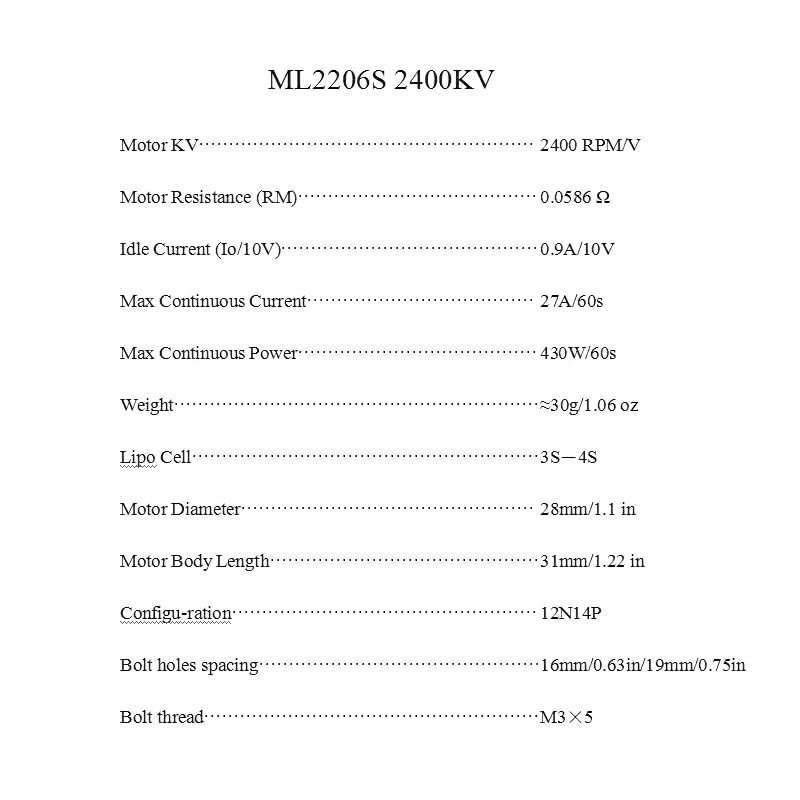 Package content: ML2206 S 2400KV CW Brushless Motor * 2 ML2206 S 2400KV CCW brushless motor * 2 When using the screws we provided, pay attention to that if the thickness of the mounting plate of the motor is too thin, it may cause the screws too long and push up to the motor coil.