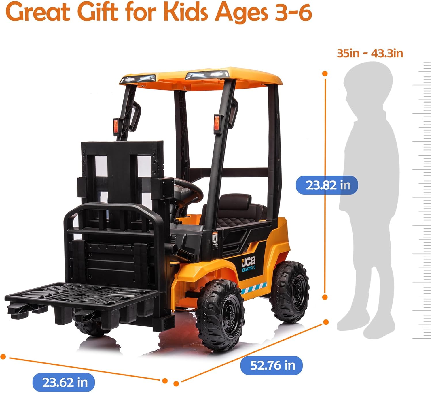 FORESEE 12V Ride on Forklift Toy is a series of electric construction vehicles specially designed for children. This electric forklift toy, licensed by JCB official brand.Battery:12V 4.5AHMotor:25W x 2Forklift Car Size: 52.76x23.62x38.82 inches (L x W x H)Forklift for Kids Drivable Size: YellowWheel Diameter: 9.4 inchesSeat Length: 12.6 inchesRC Mode: 3 Speeds OptionsManual Mode: 2 Speeds AccessibleForklift Ride on Load Capacity: 66LBS (30KG)Forklift Pallet Load Capacity: 13LBS (6KG)Playtime: Around 1~2 Hours (Fluctuates according to factors like load, speed, road surface & temperature)Safety Features for Peace of Mind: kids forklift ride on toy safety is paramount, which is why our forklift toy is equipped with a range of safety features. From a 3-point safety belt and locked double door design to a slow start function, we've taken every measure to protect children during their playtime adventures.