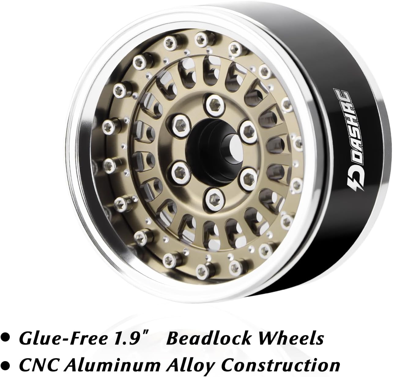 DashRC 1.9″ BEADLOCK WHEELSGlue-free 1.9″ beadlock wheels for quick tire installationCNC aluminum alloy construction for durabilityFour adjustable negative offset options for improved stabilityFits most 1/10 RC crawlers with 12mm hex hubsSPECIFICATIONSMaterial: Aluminum AlloyWheel Size: 1.9 InchDiameter: 54.5mm / 2.15inWidth: 29.5mm / 1.16inHex Size: 12mm / 0.47inAdjustable Offset: −3mm / −9mm / −10mm / −15mmWeight: 66g (0.15lb) per wheel (fully assembled) Color Options: Space Grey / Desert GoldPACKAGE INCLUDES4 × 1.9″ Beadlock Wheels1 × Screw Set