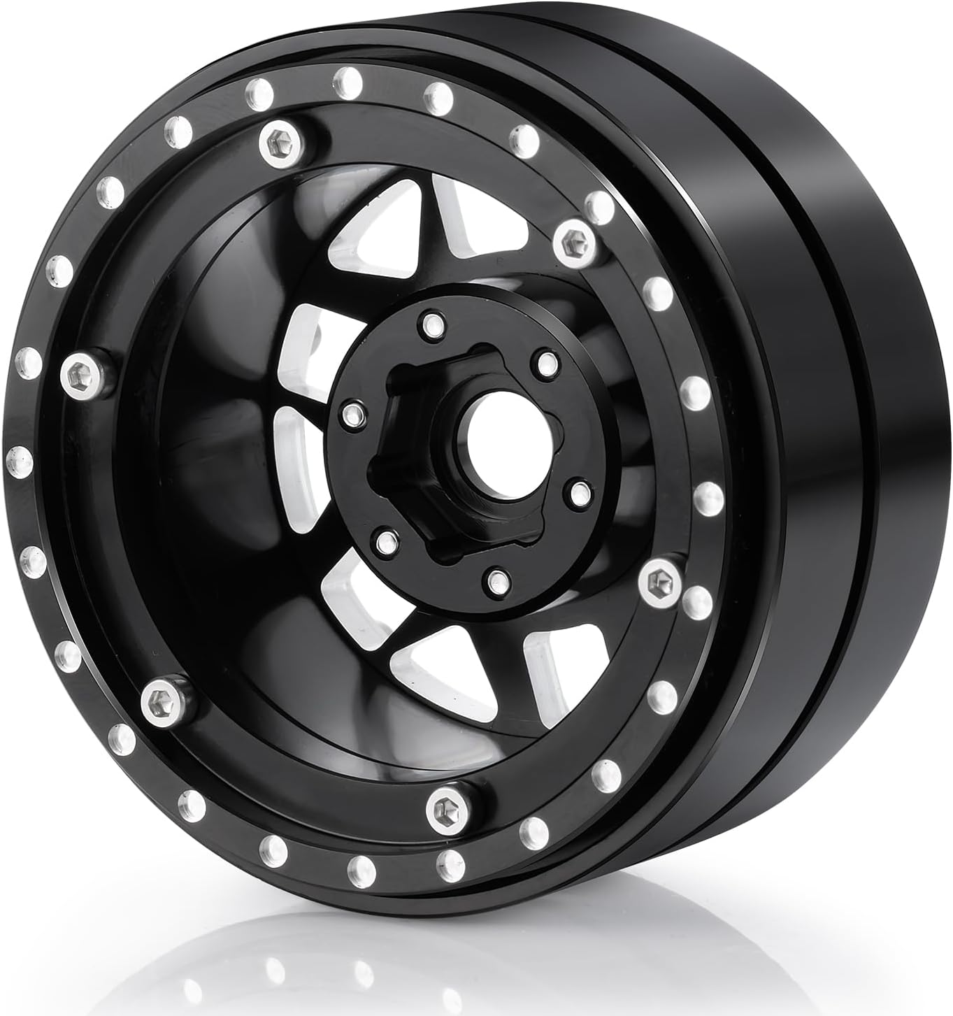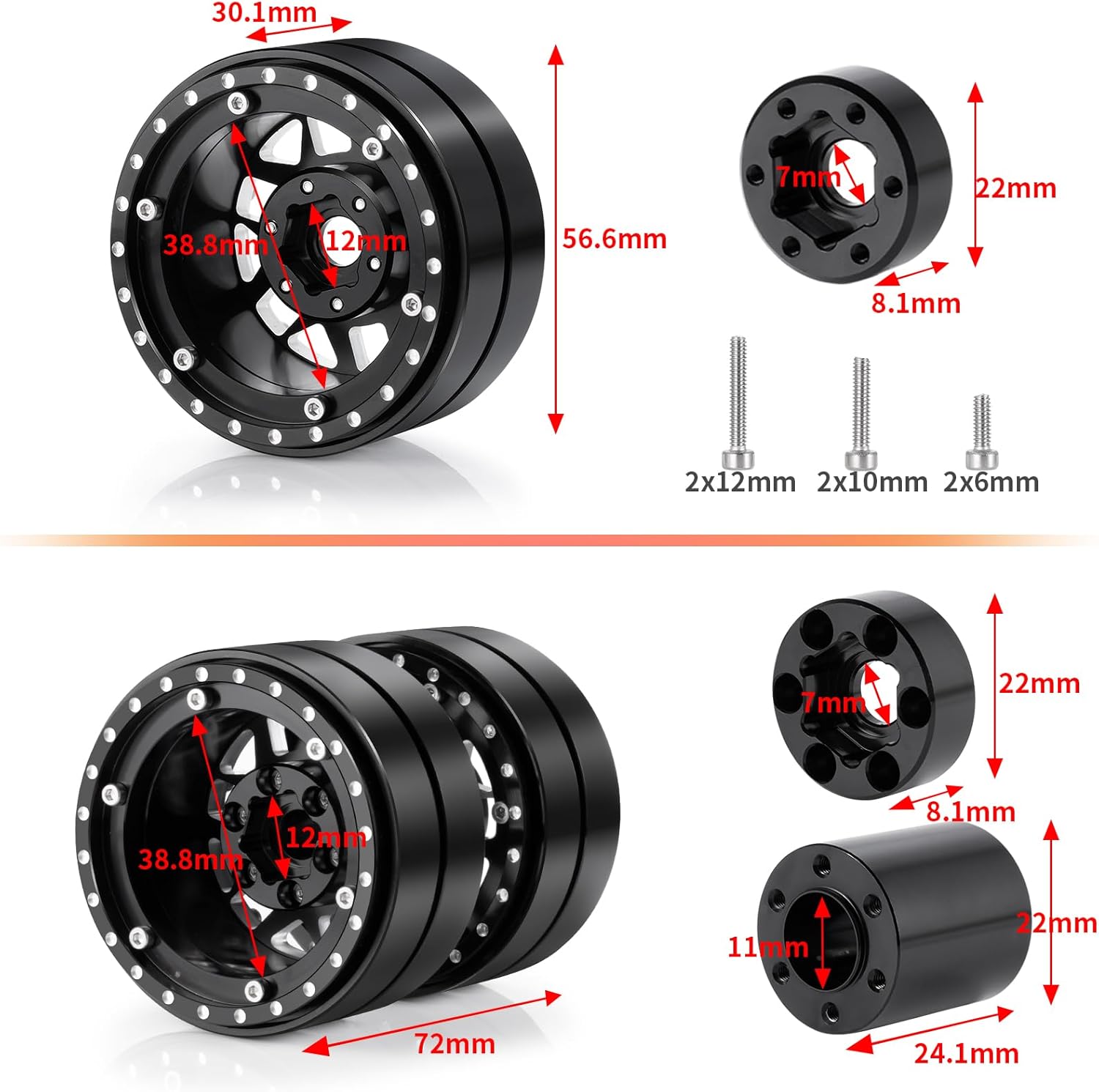 Upgrade your RC crawler's performance and style with SWX heavy-duty 1.9" twin beadlock wheels. Features: 1.Crafted from durable aluminum, these wheels boast a dual hub design for enhanced stability on rugged terrain. 2.The wider 72mm width and 56.5mm height provide a commanding presence, while the 12mm hex ensures compatibility with most 1/10 scale RC crawlers like the SCX10 and TRX-4. 3.Whether conquering rocky trails or navigating obstacles, these twin wheels offer superior traction and control.
