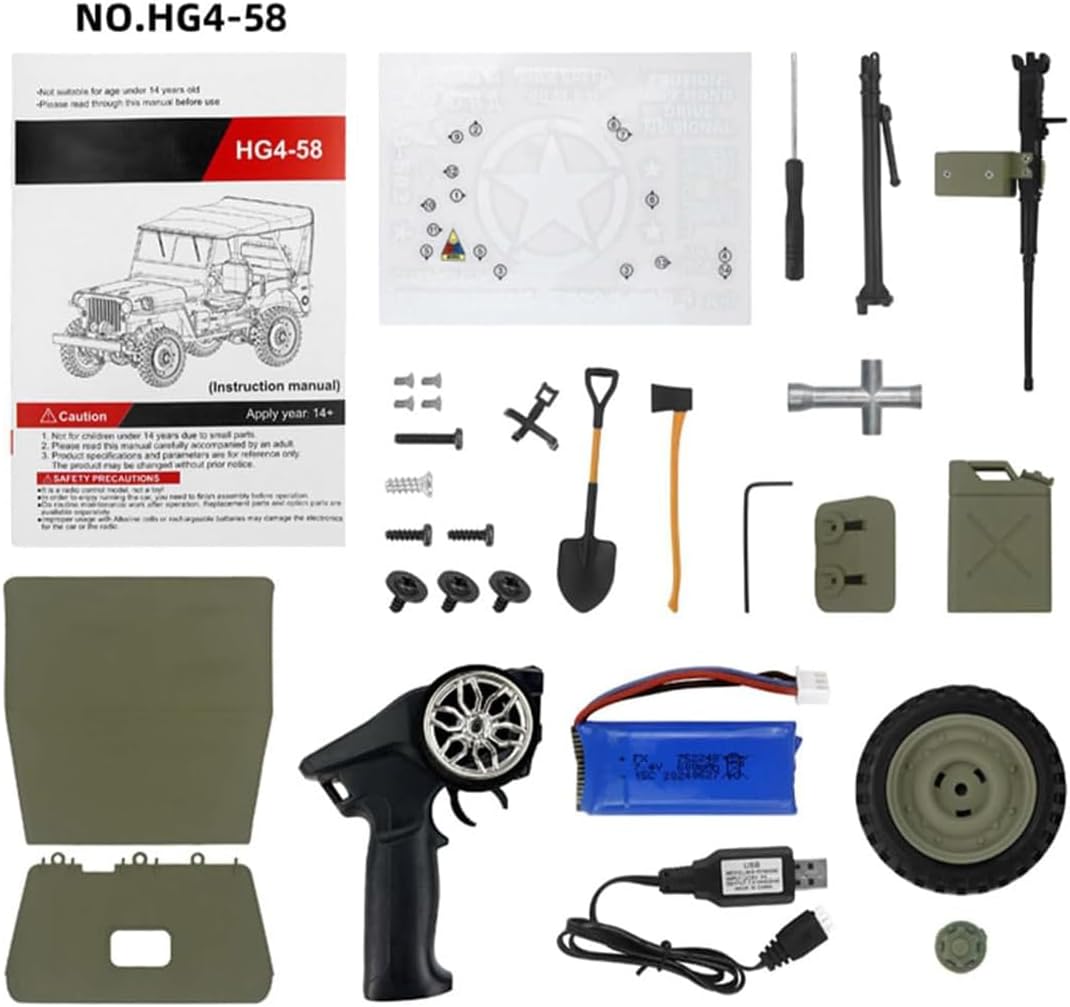 .Car*1 .Remote Control *1 .Body Battery *1 .Manual *1 .Charging Cable *1 .Spare Tire *1 .Roof Replacement Part *1 .Alloy Machine Gun *1 .Shovel *1 .Axe *1 .Oil Barrel *1 .Sticker *1