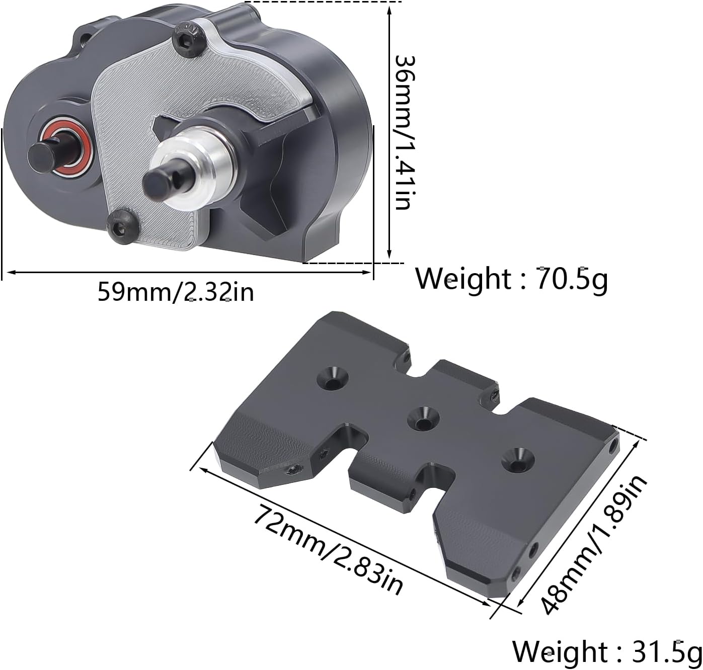 Specifications: 1.Grade 5 Titanium output shafts 2.Use 12T pinion gear as a starting point for most AR44 applications with overdrive front gears 3.7075 high strength aluminum case 4.38% overdrive when used with underdrive and overdrive ring and pinion. 5.Comes with all necessary hardware and instructions for easy installation Weight: Transmission: 70.5g / 2.52oz Skid Plate: 31.5g / 1.11oz