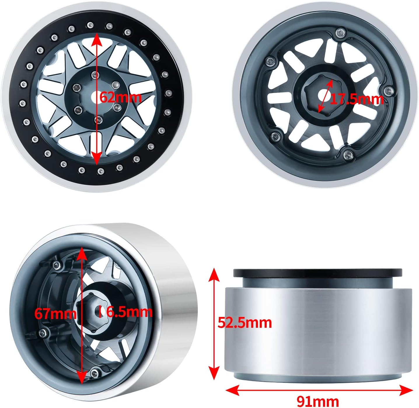 Features: The smallest screws are used on the outer wheel rings. The big longer screws are used on the middle nut, and the big short screws are used on the back of the hub. Beadlock design, don't need to glue CNC machined and aluminum anodized finish Equipped with a cover to hide the nut on axle Suit for 1:6 RC Crawler Car Axial SCX6 Specifications: Color: Outer Black Inner Gray Material: Aluminum Alloy Quantity: 4PCS Weight: 297g / 10.48oz Outer Diameter: 82mm / 3.23in Inner Diameter: 70mm / 2.76in Width: 52mm / 2.05in Drive Hex: 17mm / 0.67in Package List: 4PCS RC Car Wheel Rims