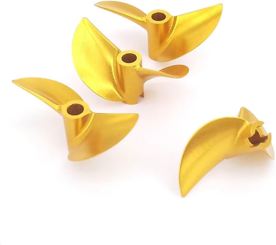 -- Description --These Wide "V" shape propellers are made of 7075 aluminum alloy with anodized gold color finish for RC racing boat, speed boat, Hydroplane, Catamaran, Shrimp boat.Made by CNC, high hardness, high strength, good balanceThere are many sizes optional.please choose the correct size for your boat when purchasing.Tips:Right-Hand(RH): which rotates clockwise as viewed from the stern when in forward gearLeft-Hand(LH): which rotates counter clockwise as viewed from the stern when in forward gear Please note: this propeller is not suitable for monohull.-- Specification & Features * Material: aluminum alloy(7075)* CNC Made, anodized gold color finished* Pitch Ratio: 1.6* Hub hole diameter: 4.76mm(3/16")* Diameter: 38mm/40mm/41mm/42mm/43mm/44mm/45mm/46mm optional* Type: Left Hand/Right Hand optional-- Item Contains --1 piece of Aluminum Propeller for RC Hydroplane Catamaran