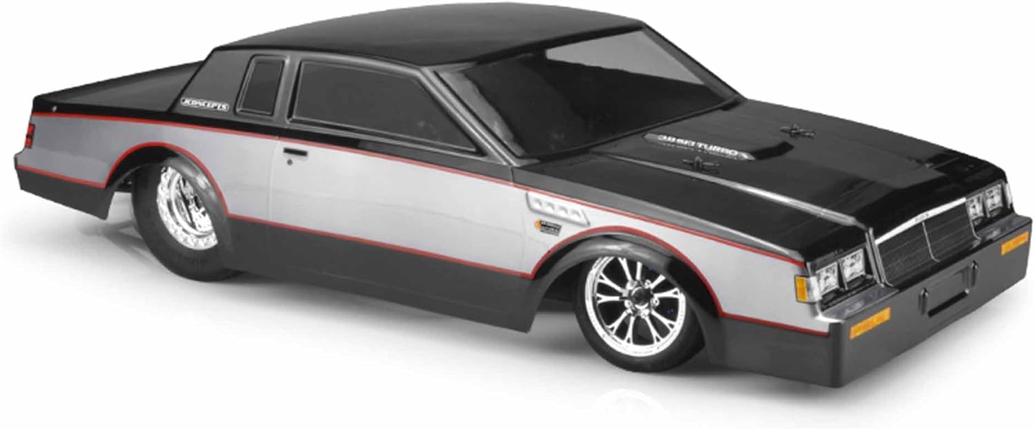 1987 Buick Grand National: The American produced, sinister, wedged shaped vehicle is now released to the RC enthusiast to fit the latest Street Eliminator vehicles on the market. The crew in the JConcepts R&D department tackled one of its finest projects to date and together with Chevrolet licensing has produced some exciting muscle. The G-body construction is a shape fit for the RC scene. The vehicles which are wide-bodied, flat paneled and have a low-roof line always track well down the racetrack. A low front chin, bumper construction and pocketed headlights immediately look like punishment is headed your way. The long and swooping quarter-panels are a staple of this generation vehicle and it certainly cuts like a knife on the drag strip. Fender flares are apparent and appropriately positioned and sized for tires like the #3193 and #3194 Hotties tires. The cab itself is one of the identifiable features of the GNX and its balanced positioning and sharp lines makes competitors retreat in fear. Rear bumper creation was detailed even allowing position for personalized license plate from the included decal sheet. A small built-in rear spoiler keeps things looking original for those sleepy builds and creations. Included in each body set, a 1987 Buick Grand National decal sheet and the paint mask for all windows. As always, each body set is backed with JConcepts customer support and racing heritage. Specifications: The Grand National measures a 13.00" wheelbase and the inside dimensions of the body are 12.00" front and rear. The body is built for a 2wd SCT wheelbase length and narrowed to more resemble the original 1:1 counterpart. It is helpful to plan your build, take measurements and modify your platform to fit inside the boundaries of the Buick body