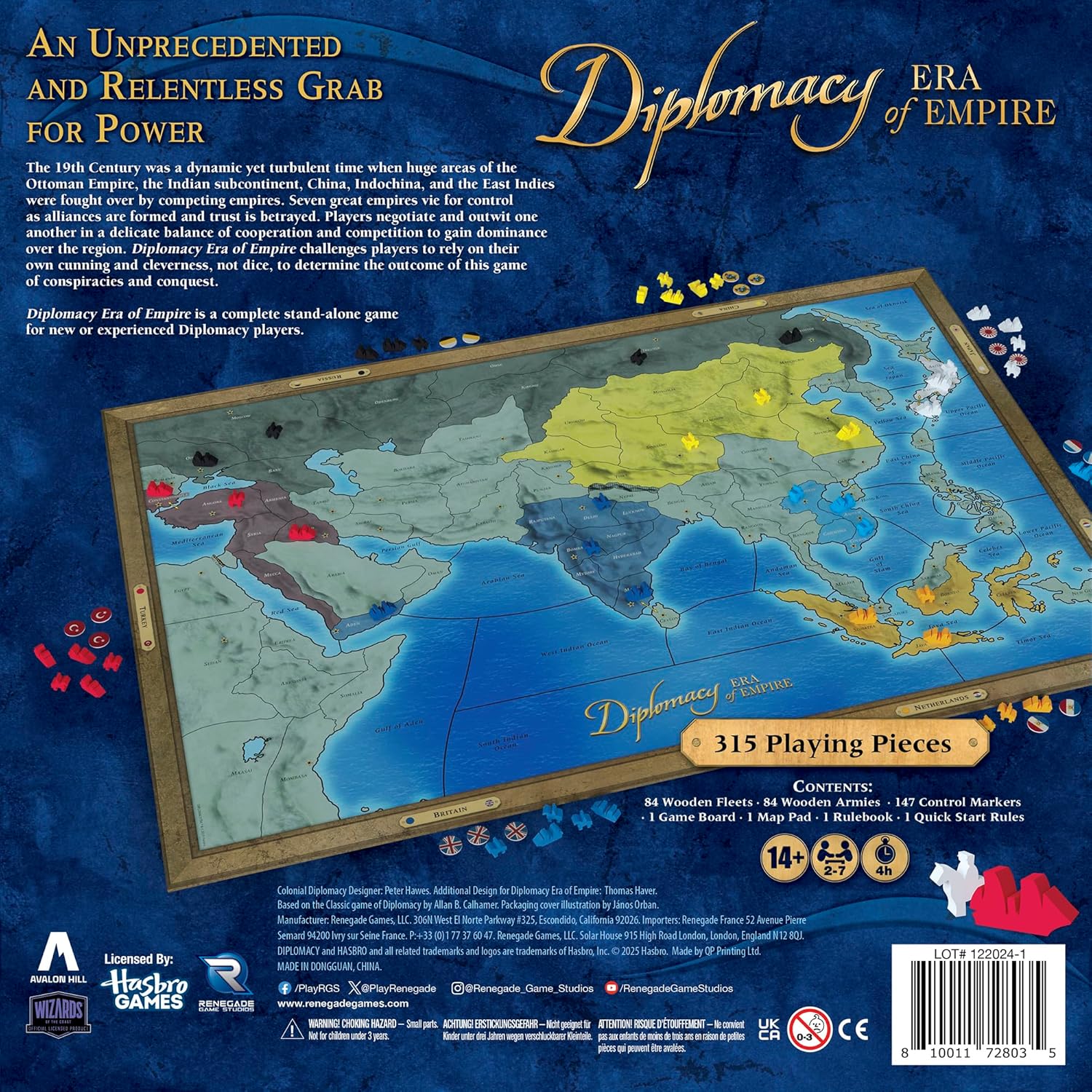 Diplomacy: Era of Empire transports strategy enthusiasts to the turbulent 19th century, when competing empires vied for control of vast territories across the Ottoman Empire, India, China, Indochina, and the East Indies. This stand-alone board game challenges players to forge alliances, negotiate ruthlessly, and betray trust in pursuit of imperial dominance. Game Features: Seven great powers compete in a game of cunning, cleverness, confidence, and collusion Skill-based gameplay: No dice determine outcomes—only negotiation, strategy, and diplomatic finesse Two to seven players engage in shifting alliances and delicate power balances Approximately four hours of engaging multiplayer strategy Complete components: Gameboard, 147 double-sided country tokens, 84 wooden army tokens, 84 wooden fleet tokens, storage bags, rulebook, and 20-sheet map pad Perfect for experienced board gamers seeking intellectual depth and historical immersion, as well as newcomers ready to master strategy-driven negotiation games. Each playthrough unfolds as a unique geopolitical story where your diplomacy skills determine victory.