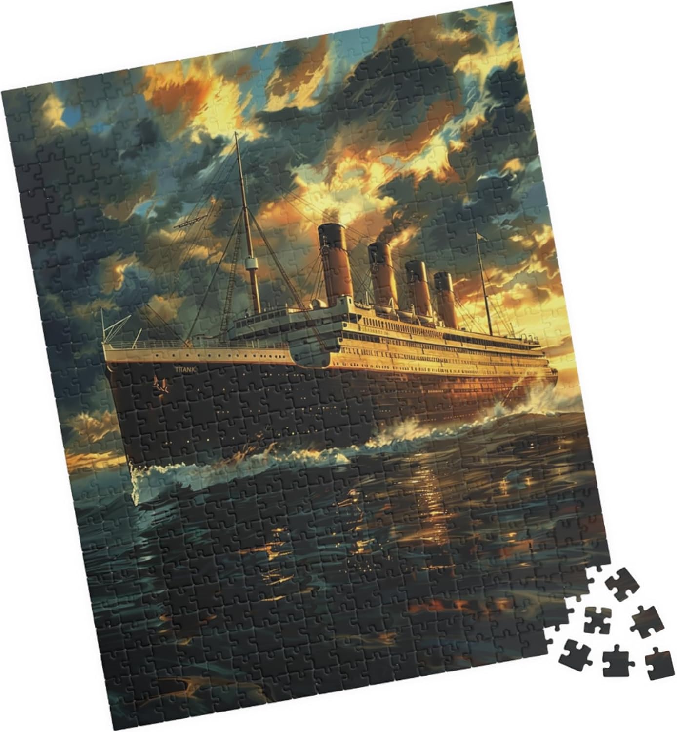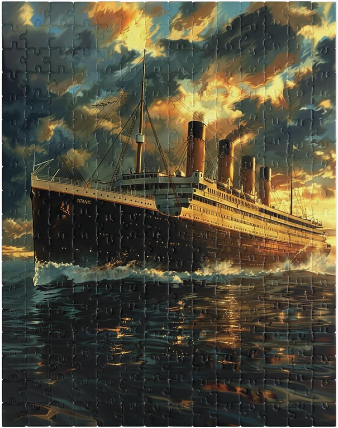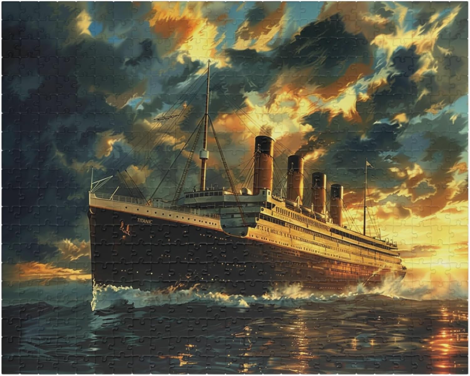Relive the grandeur of the RMS Titanic with this beautiful sunset puzzle featuring the iconic ocean liner on her maiden voyage. Available in 110, 252, 520 or 1014 pieces, there is a puzzle size for every skill level. Large, high-quality images are printed on sturdy chipboard and laminated for a glossy finish that makes each piece easy to distinguish. A reference print is also included to help guide completion. Whether displayed horizontally or vertically, this historic puzzle provides an immersive experience to assemble the Titanic as she sailed into her fateful night. Perfect for both casual puzzlers and those seeking a challenge, it makes a thoughtful gift for any fan of maritime history or jigsaw puzzles. Assembly is simple yet satisfying for puzzlers of all ages.