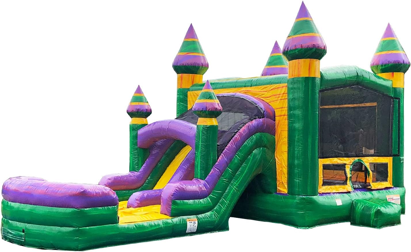The JumpOrange 15 Ft Dual-Lane Titanium Combo is a professional-grade, high-capacity inflatable engineered to deliver a massive water park experience with a sleek, modern aesthetic. Standing an impressive 15 feet tall, this versatile unit features a dual-lane slide for side-by-side racing and a spacious jumping arena, providing a year-round entertainment solution for the whole family. Engineered for maximum longevity, the Titanium Series is built with 100% commercial-grade PVC vinyl in a sophisticated marble gray finish, utilizing advanced heat-sealed seams in the slide and pool areas to prevent water leakage and ensure a structurally sound play environment even during high-energy use. Engineered with ""Water-Ready"" technology, this combo is the ultimate summer solution for those who value both performance and style. It comes equipped with a built-in misting system and an attached splash pool that connects easily to any standard garden hose, creating a consistent ""slick"" surface for high-speed sliding. To ensure safety and ease of use, the unit integrates non-slip stairs for secure climbing and multiple heavy-duty deflation zippers with built-in drains for efficient drying and cleanup after wet use. The high-density, titanium-strength vinyl construction is non-porous, allowing for quick sanitization and effortless maintenance. Beyond its striking, industrial-themed aesthetic, this combo is designed for home-friendly convenience without sacrificing industrial strength. The commercial-reinforced stress points and tear-resistant PVC handle the weight of multiple participants with ease, while the interior basketball hoop adds an extra layer of athletic play. This unit provides the perfect balance of a high-impact, professional-standard attraction and a streamlined design that is easy to set up, maneuver, and store in a residential setting. Choosing the Titanium Combo means investing in a robust, all-season centerpiece that is built to withstand years of family fun with a look that stands out from the crowd.