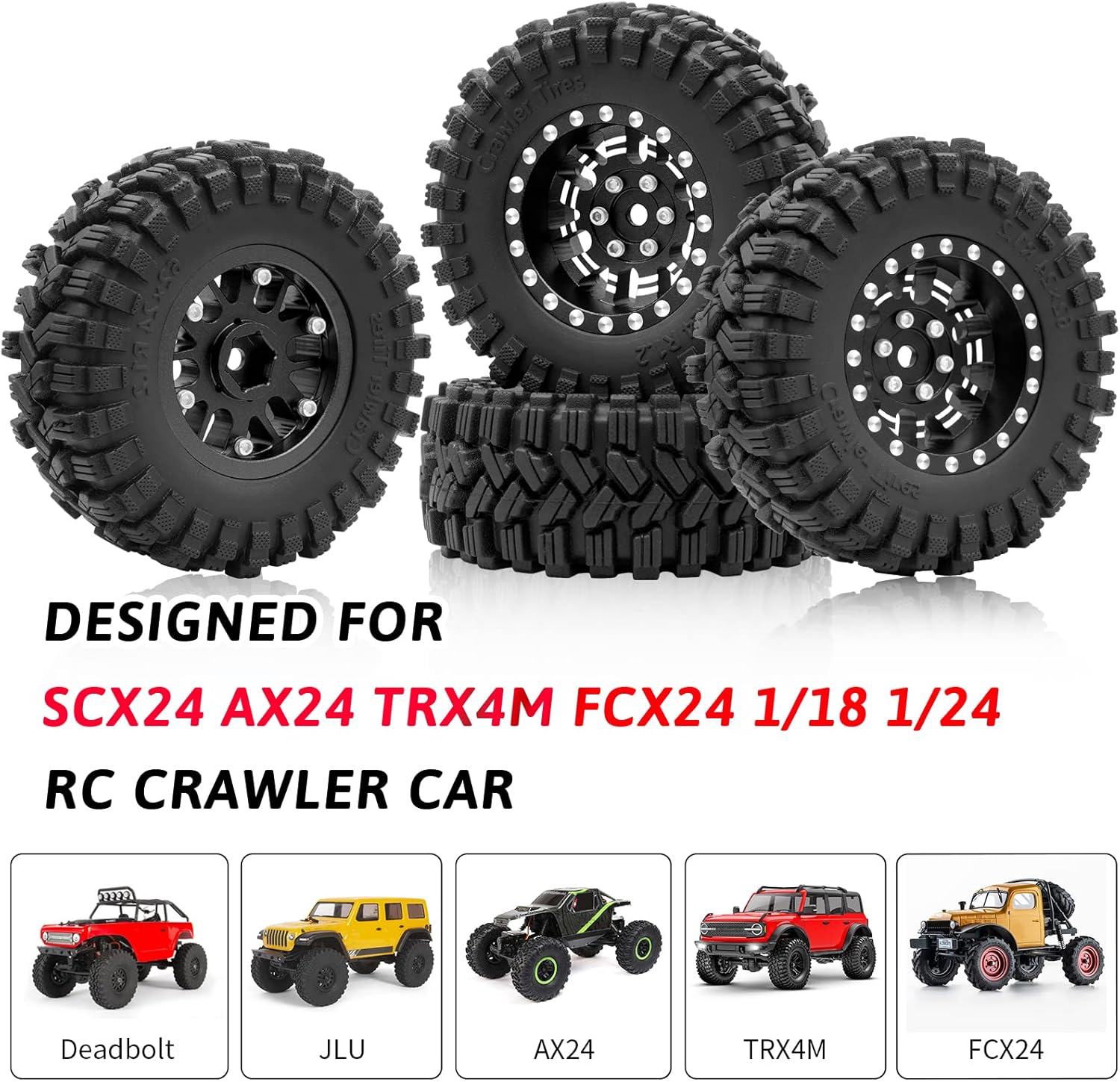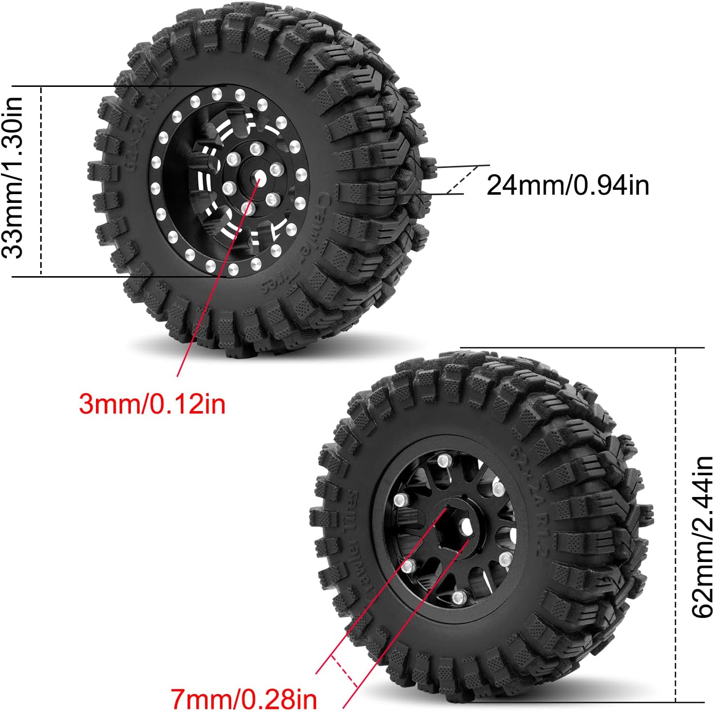 Features: The actual size of these 1.0 Plus wheels is 1.2 inches, was much more powerful. SS-compound, soft and sticky, high adhesion provides unimaginable grip. 7mm Negative offset wheel improves stability to get excellent off-road performance.Specifications: Product Name: 1.0 Plus Wheel and Tires Color: Black/Red/Green/Blue Quantity: 4Pcs/Set Material: OGRC SS-compound, Aluminum Alloy Single Weight: 40g/PC Gross Weight: About 160gPackage list: 4 * 1.2 Wheel and Tires 1 * Screw Set