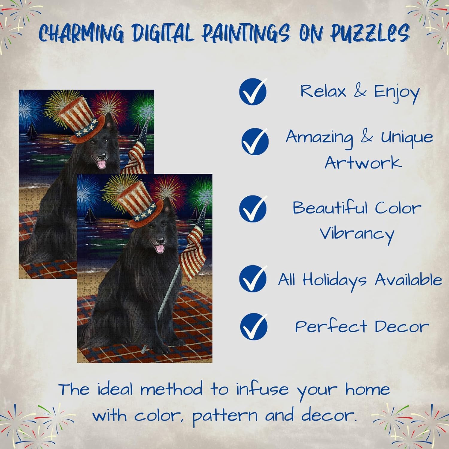 Engage your problem-solving skills with our delightful dog and cat themed jigsaw puzzles. These puzzles offer a challenging and entertaining activity that promotes hand-eye coordination, stimulates thinking ability, enhances patience, and fosters focus. As you piece together the puzzle, you'll experience a quieting of the mind and a state of creative meditation. Immerse yourself in the world of pets with our captivating cat and dog themed jigsaw puzzles. These puzzles are designed to entertain and engage, building concentration, creativity, and problem-solving skills. They provide a rewarding experience for adults, offering a break from daily routines and an opportunity to unwind and relax. Our jigsaw puzzles are the perfect indoor entertainment. Whether you're completing them with family or friends, they create a bond and make moments more intimate. Ideal for holidays such as Christmas, Thanksgiving, Easter, St. Patrick's Day, 4th of July, and many more, these puzzles add joy and amusement to every celebration. Our puzzles come in a sturdy cardboard box featuring the image of the artwork, ensuring easy storage and organization. They are available in three sizes: 300, 500, and 1000 pieces. The precision-cut interlocking pieces guarantee a satisfying and seamless puzzle-solving experience.