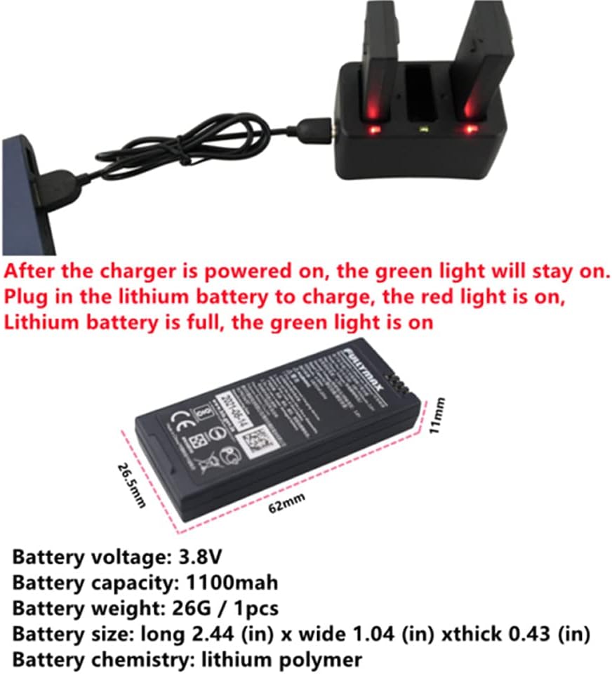 DESCRIPTION:1.3.8V 1100mAh rechargeable lithium battery compatible with DJI TELLO quadcopter, 100% brand new and high quality, strong endurance2.1100mAh battery capacity, can provide more battery life, packaged with 2PCS lithium battery, fully guarantee the flight time, do not worry about the lack of power3.With a black 3-in-1 charging, it can charge 3 batteries at the same time, and get a fully charged battery faster.4.How the charger works: After the charging box is connected to the power supply, 3 green lights are on, the red light is on and charging is in progress, and the red light turns to green, indicating that the battery is fully charged.5.The weight of a single battery is 50g, and the charging weight is 42g. It is light, compact and easy to carry.PRODUCT INFORMATION:1.Product name: rechargeable lithium battery2.Charging limit voltage: 4.35V3.Nominal voltage: 3.8V4.Rated capacity: 1100mAh5.Battery size: 60X25X10mm6.Battery weight: 50g (single)7.Charger weight: 42gPACKAGE INCLUDES:2PCS lithium battery1PCS 3 in 1 chargerWARNING:1.Must use dedicated charging equipment2.It is strictly prohibited to disassemble, puncture, hit, squeeze, short-circuit and burn the battery3.Prohibited to use the battery after water has enteredHOW THE CHARGER WORKS:After the charging box is connected to the power supply, the 3 green lights are on, the red light is on and charging is in progress, and the red light turns to green, indicating that the battery is fully charged.