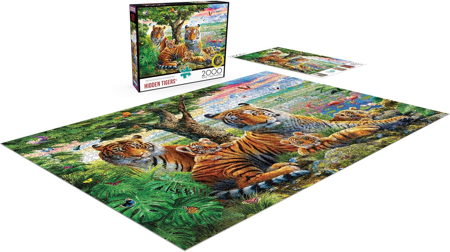 Take a walk on the wild side as you put together this 2000 piece jigsaw puzzle. Once you have completed this puzzle of a majestic tiger family, search for 12 hidden tigers as an added challenge! Every Buffalo Games jigsaw Puzzle is manufactured in the United States from recycled Puzzle board. A precision cutting technique guarantees that every piece will fit soundly with the company's signature Perfect SnapTM. A bonus Puzzle poster is also included so that you have a handy reference of what the completed Puzzle should look like while you put yours together.