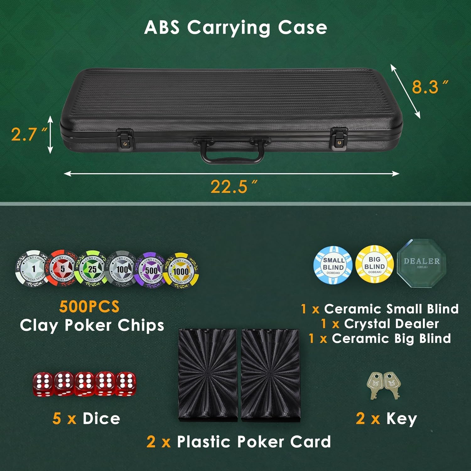 | Included Components | 500 PCS Poker Chip Set |