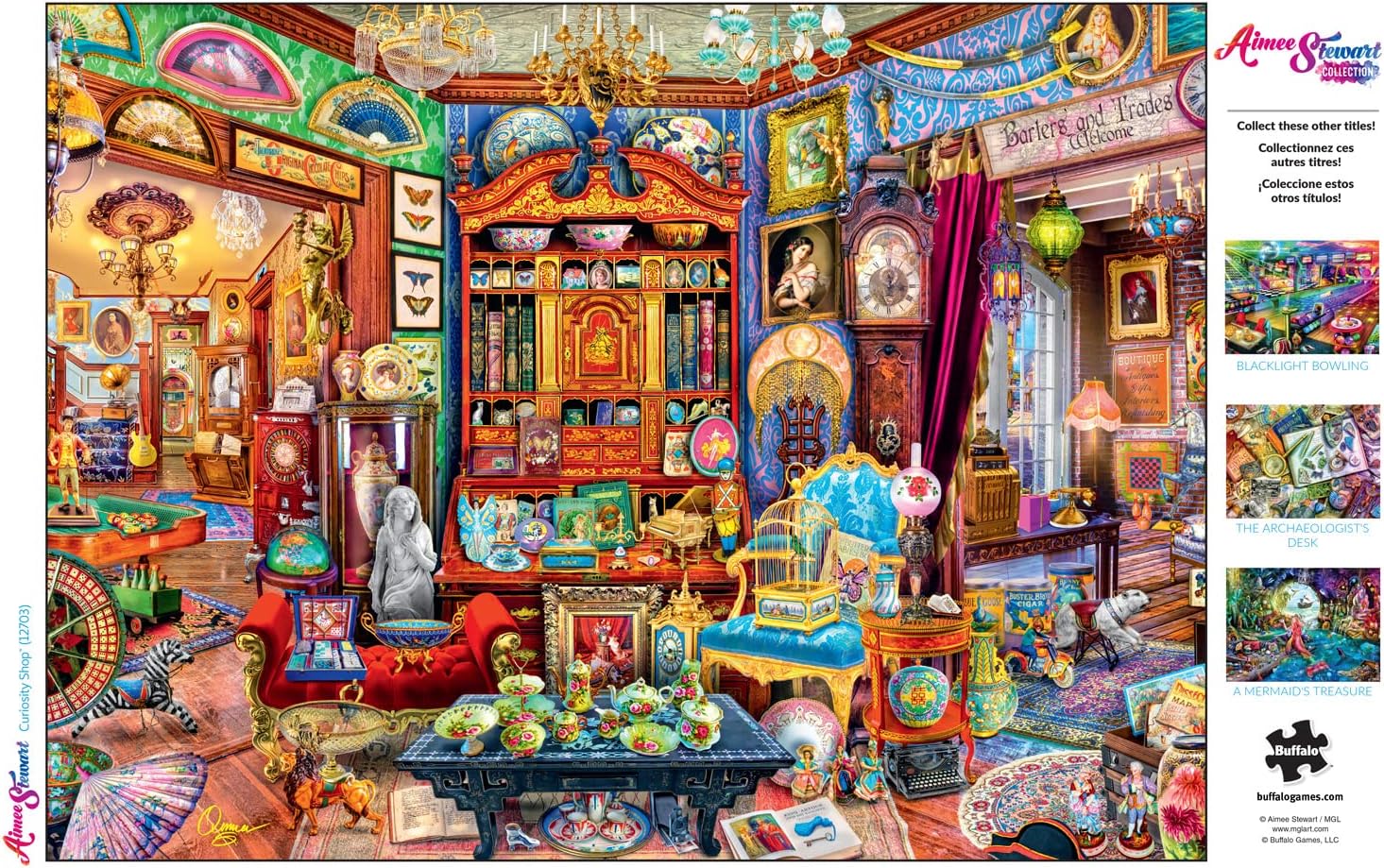 This 1000-piece jigsaw puzzle, “Curiosity Shop,” is based on the artwork of Aimee Stewart. This shop is filled with oddities and treasures and unique surprises. Fanciful tea sets, mystical statues, decorative pieces and so much more! What will you find in this wonderous shop of curiosities? Stewart is a self-taught artist who specializes in lush, electric digital painting and photo-manipulation. Heavily inspired by music and literature, Stewart works from the heart to bring her unique visions to life. Every Buffalo Games jigsaw puzzle is manufactured using premium quality 100% recycled paperboard. A precision cutting technique guarantees that every piece will fit soundly with the company's signature Perfect Snap™. A bonus puzzle poster is also included so that you have a handy reference of what the completed puzzle should look like while you put yours together.