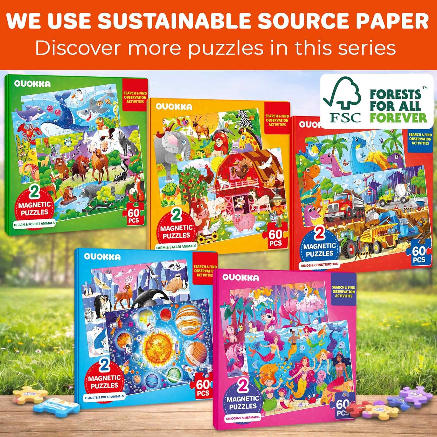 Two QUOKKA magnetic puzzle books in one set. Search & find book with 2x60-piece ocean & forest scenes — pieces stay secure, folds flat. Advanced 100-piece book with dinosaur & city scenes plus spot-the-difference maps for ages 4-8. Both travel-friendly and perfect for independent play.