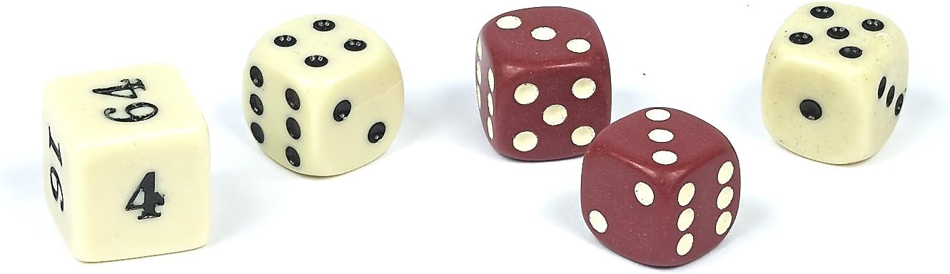 Set of 5 dice with rounded corners. Engraved dice 5/8" (16mm) Doubling cube 3/4"(19mm). Complete with a rosewood box. Dice imported from the Orient, box from India.