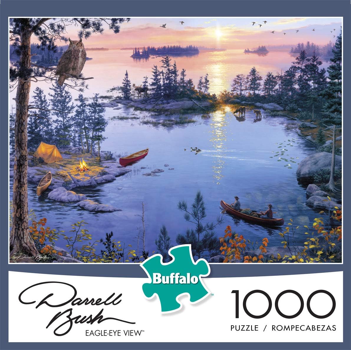 From an eagle’s perspective, this puzzle captures the picturesque site of adventurers, retreating back to their camp, from a long day on the lake. Enjoy this 1000 piece puzzle by Darrel Bush titled “Eagle-Eye View”. Capture this quiet and pleasant scenery, where only the distant sound of quacking ducks, and the crackles of the nearby campfire can be heard. Bush paints a variety of subjects ranging from wildlife to landscapes, seascapes, nostalgia, and even occasional still-life. One element echoing through all of his art is the luminescent presence of light. Along with being named among America's 12 most popular artists by four different national art publications, Darrell Bush has won two national stamp competitions for the state of Minnesota and Idaho. Every Buffalo Games jigsaw puzzle is manufactured from recycled puzzle board. s signature Perfect Snap™. A bonus puzzle poster is also included so that you have a handy reference of what the completed puzzle should look like while you put yours together.