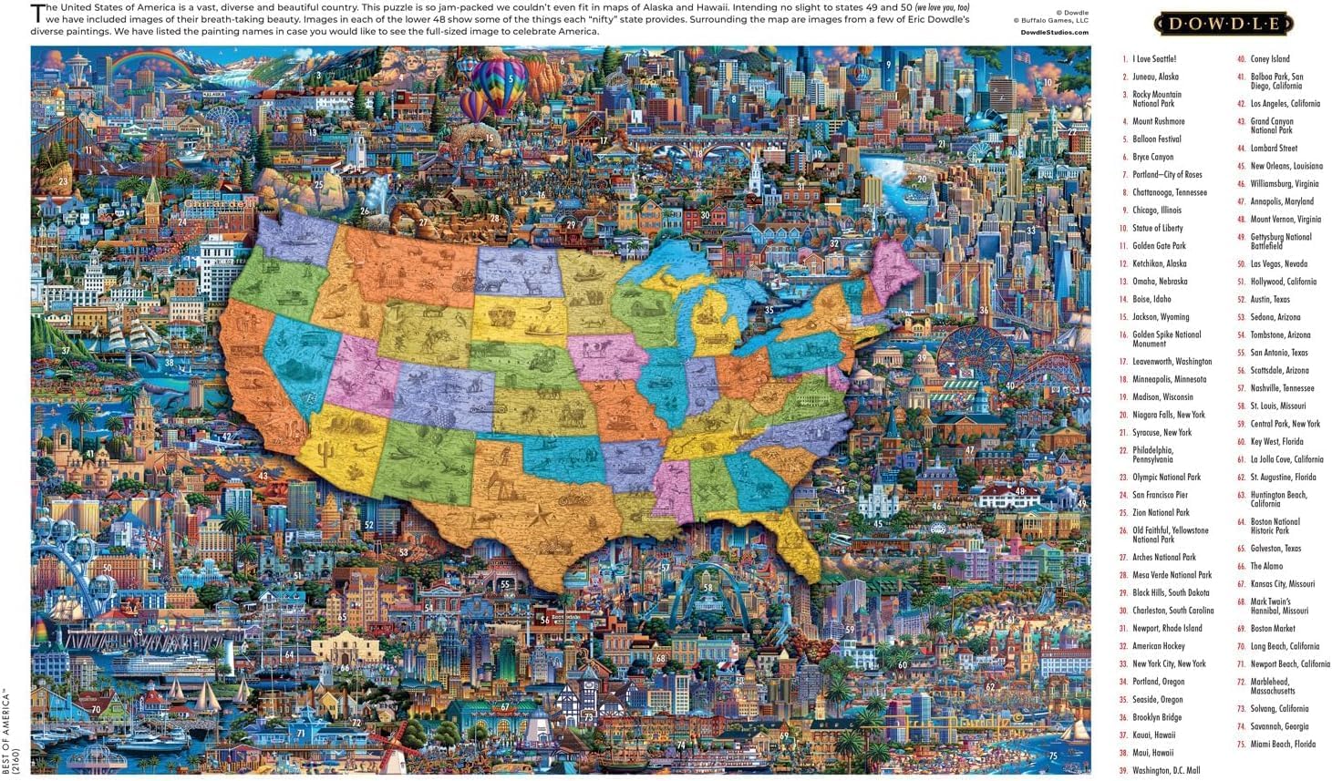 This 2000-piece jigsaw puzzle titled “Best of America” is based on the artwork of Eric Dowdle. Surrounding a map of the Contiguous United States are images from multiple Dowdle paintings highlighting the vast and diverse beauty of our country. Eric Dowdle was born the tenth of 12 children to a family of storytellers. He has traveled the world to discover fascinating people and places to include in his art. Each Dowdle puzzle has a colorful story to tell. Every Buffalo Games jigsaw puzzle is manufactured from recycled puzzle board. A precision cutting technique guarantees that every piece will fit soundly with the company's signature Perfect Snap™. A bonus puzzle poster is also included so that you have a handy reference of what the completed puzzle should look like while you put yours together.