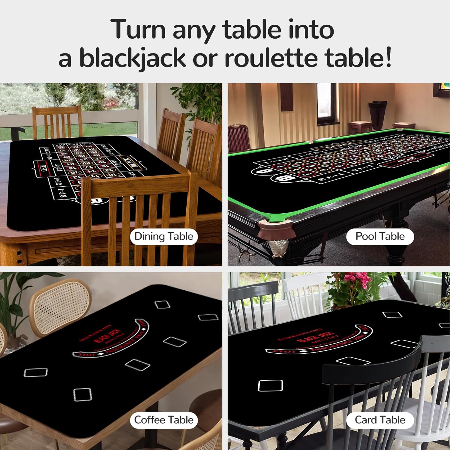 Elevate Your Game Night with The Ultimate Double-Sided Casino Experience! Tired of cluttering your home with multiple single-use gaming mats? Introducing the premium double sided poker mat that revolutionizes your game night. It's not just a mat; it's your complete, versatile, and portable gaming station designed for serious players and fun-loving families alike. Why Choose Our Reversible Poker Table Top? 2-in-1 Versatility: Get two professional-grade casino layouts for the price of one! Whether you're all in on a Texas Hold'em tournament or trying your luck at Blackjack, a simple flip is all it takes to change the game. This reversible craps tabletop layout mat maximizes fun and value. Uncompromised Quality for Real Games: We understand what players need. Our 3mm thick cushioning provides the perfect balance of comfort and functionality, protecting your table and providing a fantastic feel for card dealing and chip handling. The crystal-clear prints, including betting lines and player positions, ensure an authentic and immersive casino experience right at your kitchen table. Engineered for Durability and Stability: Spills and excited players are no match for this mat. The 100% waterproof surface wipes clean in seconds, while the advanced non-slip rubber base grips your table tenaciously, ensuring the action never stops because of a shifting surface. It's built to withstand years of regular use. The Practical Choice: Its lightweight and rollable design means your epic game night doesn't have to be a permanent setup. Cleanup is a breeze. Roll it up, strap it, and stash it away in seconds, keeping your living space neat and tidy.