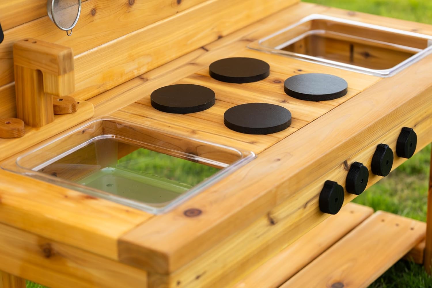 Our NEW outdoor kitchens are designed for Montessori parents in mind! Comes with a wooden faucet and 4 burner stovetop with real turning knobs! Backsplash comes with 6 hooks, perfect for hanging utensils and pots and pans. This is a wonderful backyard furniture addition to your playground or playhouse structure. Great for ages 36 months to 7 years old. Made entirely of cedar wood. Finished with natural stain. INCLUDES two large plastic bins for sensory play. Assembly hardware included. Handmade from a small shop in Canada. Dimensions: 44"L x 19" W x 35" H *Accessories (other than hardware and sinks) not included.