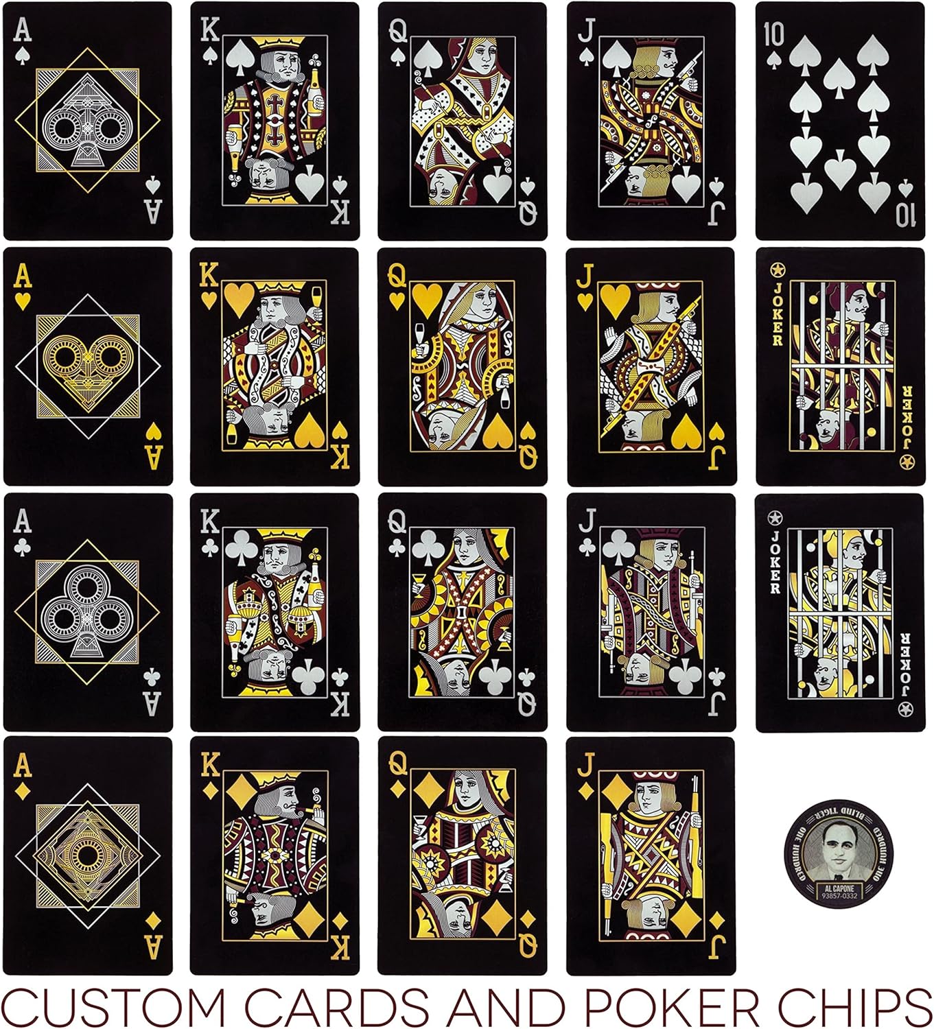 Get Filthy Rich!Filthy with glitz, glamour, and gangsters, Prohibition marked the origin of organized crime. Each poker chip in our Blind Tiger poker chip tin gift set immortalizes one of its most famous mugs, and our black playing cards feature gilded art deco aces and custom face cards with nods to gats, grifters, gaspers, and gin rickeys. There are six denominations of custom poker chips in all, each featuring an infamous gangster: Meyer Lansky, Bugs Moran, Lucky Luciano, Al Capone, Johnny Torrio, and Enoch Johnson. Each deck of Blind Tiger cards features ornate art deco cardbacks, striking black cardfronts, and custom gun and drink-toting gangster face cards. Our set includes 200 poker chips and is broken out as follows: White $1, 50 chipsRed $5, 50 chipsGreen $25, 25 chipsBlack $100, 25 chipsPurple $500, 25 chipsYellow $1,000, 25 chips Why You'll Love It:This novelty gift tin is the perfect travel poker chip set. Weighing just under 3 pounds, it's easy to pack up, pick up, and show off your custom chips and cards--just slide the lid right off the tin poker carrying case. Great for texas holdem, blackjack, and other casino games.