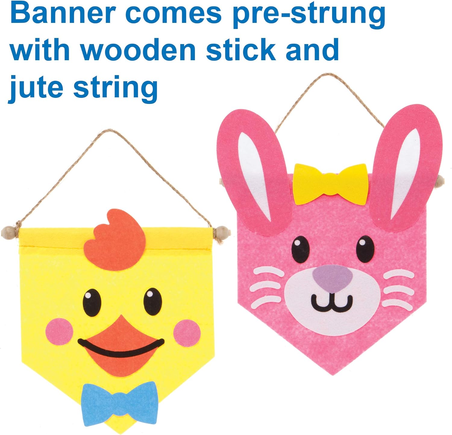 Cute Easter banners for crafts and hanging. Each kit includes felt banner and self-adhesive felt pieces. 3 assorted designs - Lamb, Rabbit and Chick. Size: 16 x 15 cm. Instructions are included (English language not guaranteed). English language not guaranteed). Glue required. Warning: Keep away from fire Banner comes pre-strung with wooden stick and jute string. Use our super strong all-purpose glue or glue dots (not included).