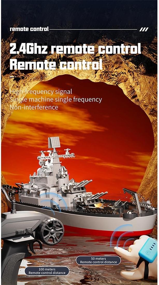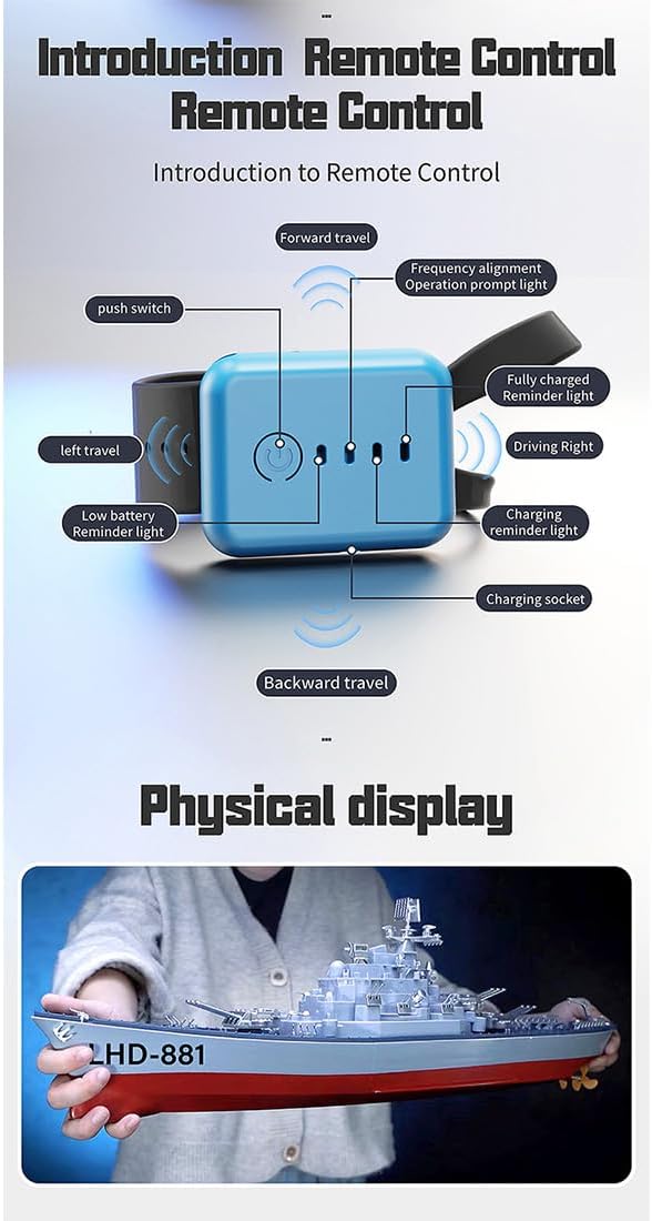 Command Your Fleet with the LHD-881 1/390 Scale RC Battleship!This high-detail RC warship combines military authenticity with advanced functionality for collectors, hobbyists, and naval enthusiasts. Whether you're racing on water or displaying its craftsmanship, the LHD-881 delivers power, precision, and realismSpecifications:.Item No.: LHD-881.Material: ABS + Electronic Components.Sailing Speed: 8-10km/h.Charger: USB Charger.Duration: 15min.Charging Time: 1.5h.Frequency: 2.4GHz.RC Distance: 100m.Applicable Occasions: Swimming Pools, Rivers, Lakes, Offshore Waters and so on..Product Features: Support forward, backward, left turn, right turn, capsize reset, precision waterproof, high-energy lithium battery, highly wind-resistant, anti-seize protection, anti-collision protection and other functions..Product Weight: 950g.Package Weight: 1850g.Product Dimensions: 60 × 11.5 × 19cm.Package Dimensions: 63 × 19 × 22cm.Packing: Graphic Carton.Ages: 16+Package Including.Boat Model *1.Remote Controller *1.Display Stand *1.Decorative Accessories Package *1.USB Charging Cable *1.Instructions *1