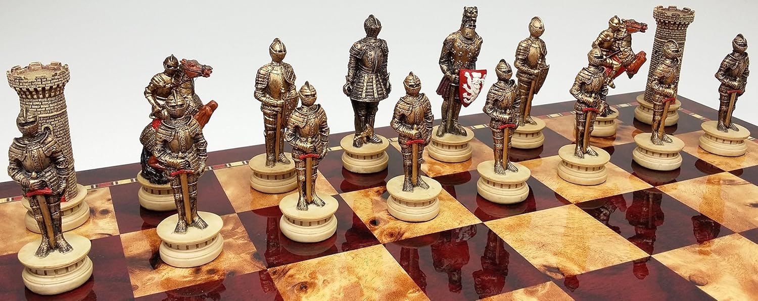 Board features a beautiful artificial high gloss cherry and burlwood color laminate over an mdf wood core. Bottom of board is completely felted. King: 3 1/4" - Queen: 3 1/8" - Bishop: 2 7/8" - Knight: 2 7/8" - Rook: 2 3/4" - Pawn: 2 5/8" Base Diameter - 1" - Total Piece Weight: - 1.75 Pounds - Board: 17 1/4 x 17 1/4 x 3 1/2. Playing surface: 15 x 15 with 1 7/8 Squares. Storage compartments are 1 5/8 x 3 3/4 in the front row, 1 5/8 X 3 5/16 in the back row. Each side has its own drawer. Board Weight: 11 pounds (Without Package)
