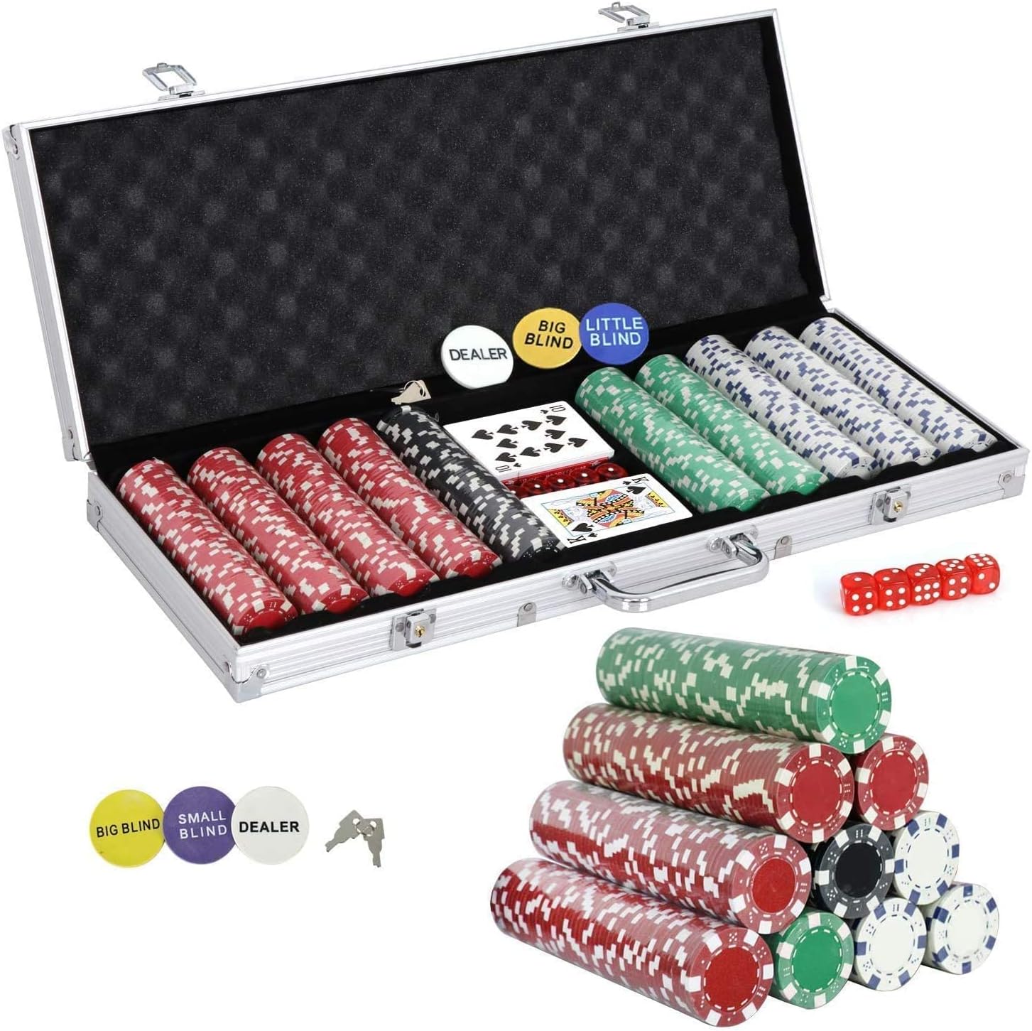 It's really difficult to find good, inexpensive, denominated chips, but you meet this our Smartxchoices one! If your looking for some quality family time this is the right thing,chips are strong and not flimsy, case is strong and durable. These are a good deal and will make any card game feel like your are at a big game table. Also,I bet you can practice your dealing skills like drop cut with these chips if you want to be a dealer! Features: ★ Chips look and feel good. ★ Enough chips for 10 players. ★ The case has a foam top on the upper part to protect your chip. ★ Carrying case makes it easier to tote them around on game nights. ★ It will be a great addition to your Friday night hangout with friends. ★ This is very good idea for “family time” during night time and weekend! ★ A little heavy to lug around but that is the result of the high quality chips. ★ It holds a lot of chips its still compact enough to travel with easily and for storage when you're not using it. ★ Great for playing poker at home and with friends, and the chips have a nice weight to them that makes them fun to toss into the pot. Package Included: -500 11.5-gram poker chips (200 red, 150 white, 100 green, 50 black) -2 X deck of cards -1 X big blind -1 X small blind -1 X dealer -1 X silver aluminum case