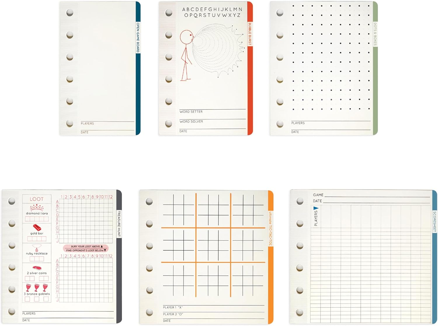 Portable Paper Games Set: The jOTBLOCK portable stacked pads GAME set is designed to provide instant fun wherever you are, no batteries required!. It includes six individual perforated game pads, each with its unique game. The set includes BUBBLE BURST, DOTS & BOXES, TREASURE HUNT, ULTIMATE TIC-TAC-TOE, OPEN GAME pad, and SCORESHEET pads, offering plenty of entertainment for family and friends.